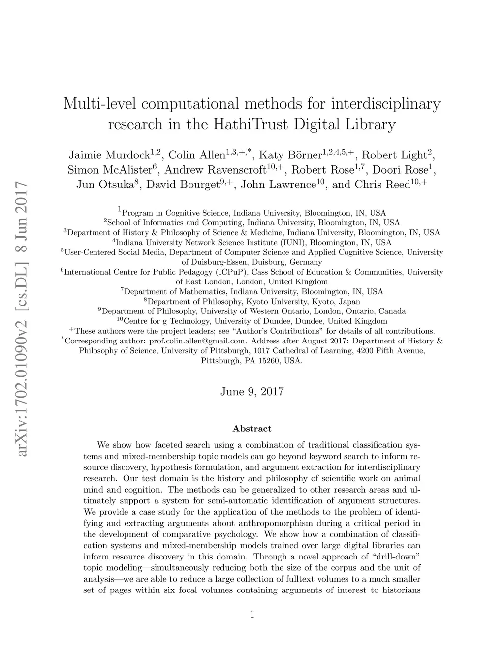 We show how faceted search using a combination of traditional classification systems and mixed-membership topic models can go beyond keyword search to inform resource discovery, hypothesis formulation, and argument extraction for interdisciplinary research. Our test domain is the history and philosophy of scientific work on animal mind and cognition. The methods can be generalized to other research areas and ultimately support a system for semi-automatic identification of argument structures. We provide a case study for the application of the methods to the problem of identifying and extracting arguments about anthropomorphism during a critical period in the development of comparative psychology. We show how a combination of classification systems and mixed-membership models trained over large digital libraries can inform resource discovery in this domain. Through a novel approach of "drill-down" topic modeling---simultaneously reducing both the size of the corpus and the unit of analysis---we are able to reduce a large collection of fulltext volumes to a much smaller set of pages within six focal volumes containing arguments of interest to historians and philosophers of comparative psychology. The volumes identified in this way did not appear among the first ten results of the keyword search in the HathiTrust digital library and the pages bear the kind of "close reading" needed to generate original interpretations that is the heart of scholarly work in the humanities. Zooming back out, we provide a way to place the books onto a map of science originally constructed from very different data and for different purposes. The multilevel approach advances understanding of the intellectual and societal contexts in which writings are interpreted.