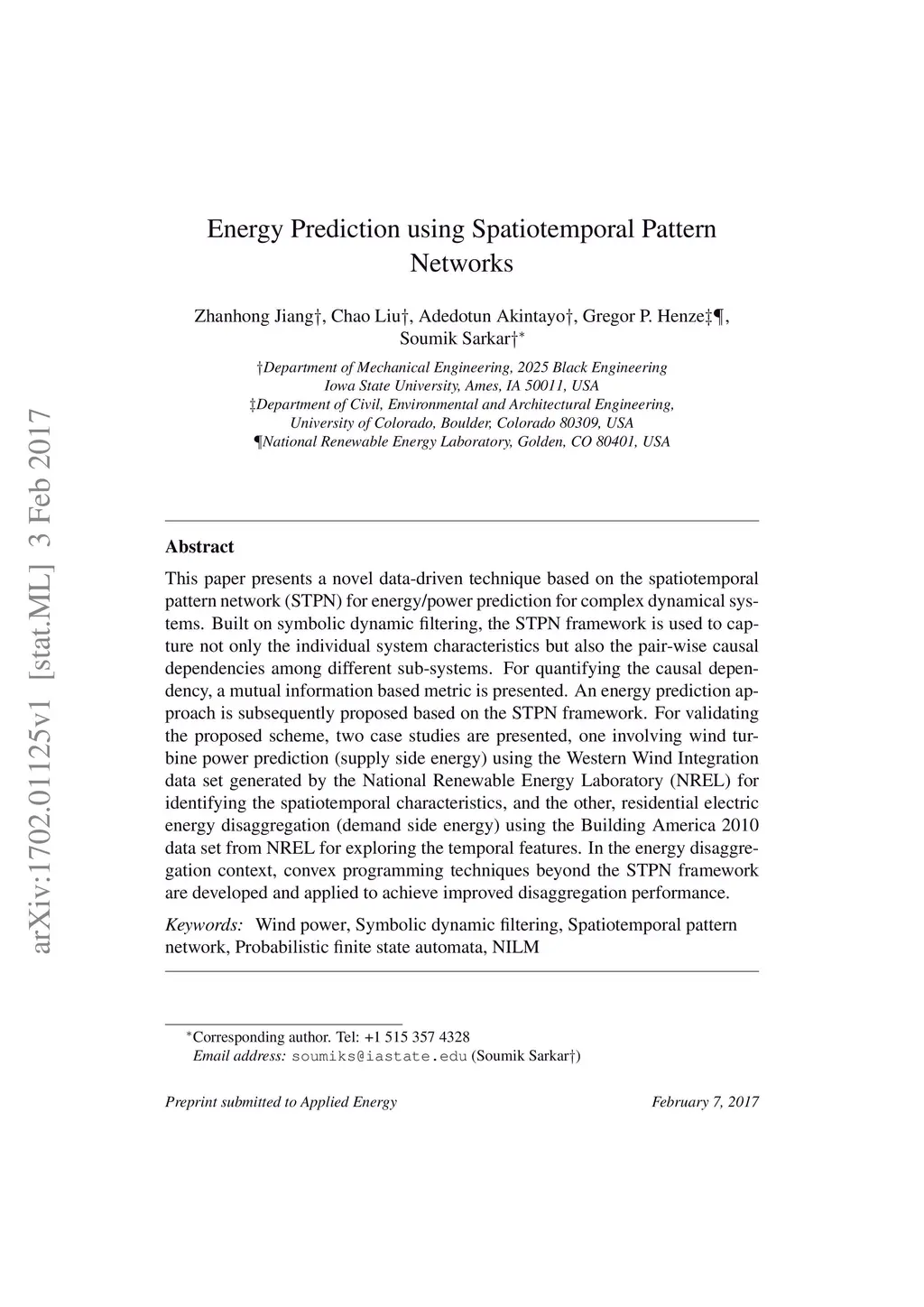This paper presents a novel data-driven technique based on the spatiotemporal pattern network (STPN) for energy/power prediction for complex dynamical systems. Built on symbolic dynamic filtering, the STPN framework is used to capture not only the individual system characteristics but also the pair-wise causal dependencies among different sub-systems. For quantifying the causal dependency, a mutual information based metric is presented. An energy prediction approach is subsequently proposed based on the STPN framework. For validating the proposed scheme, two case studies are presented, one involving wind turbine power prediction (supply side energy) using the Western Wind Integration data set generated by the National Renewable Energy Laboratory (NREL) for identifying the spatiotemporal characteristics, and the other, residential electric energy disaggregation (demand side energy) using the Building America 2010 data set from NREL for exploring the temporal features. In the energy disaggregation context, convex programming techniques beyond the STPN framework are developed and applied to achieve improved disaggregation performance.