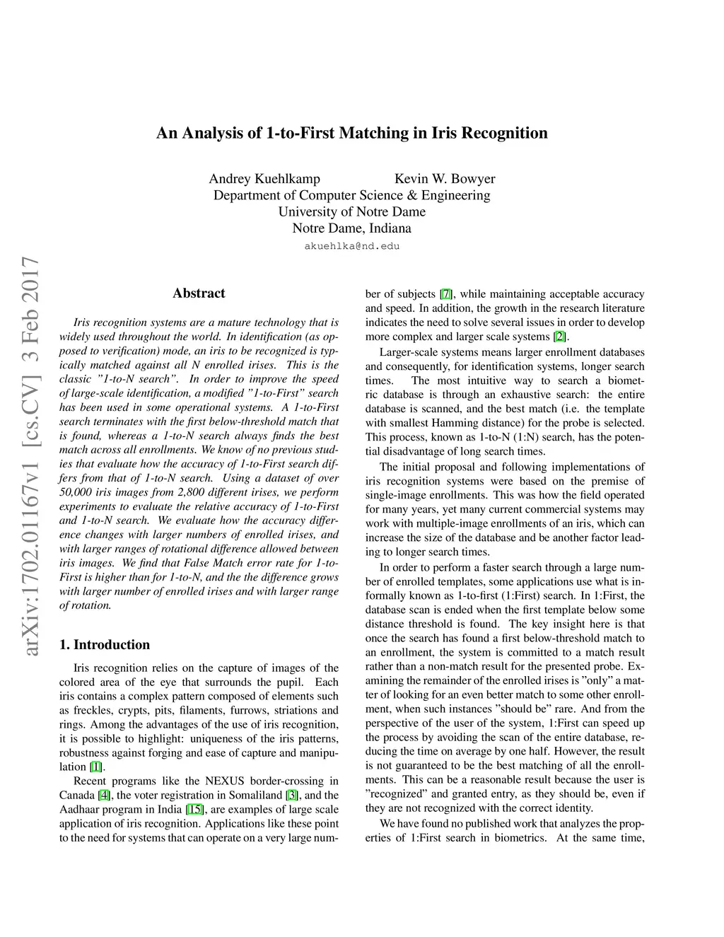 Iris recognition systems are a mature technology that is widely used throughout the world. In identification (as opposed to verification) mode, an iris to be recognized is typically matched against all N enrolled irises. This is the classic "1-to-N search". In order to improve the speed of large-scale identification, a modified "1-to-First" search has been used in some operational systems. A 1-to-First search terminates with the first below-threshold match that is found, whereas a 1-to-N search always finds the best match across all enrollments. We know of no previous studies that evaluate how the accuracy of 1-to-First search differs from that of 1-to-N search. Using a dataset of over 50,000 iris images from 2,800 different irises, we perform experiments to evaluate the relative accuracy of 1-to-First and 1-to-N search. We evaluate how the accuracy difference changes with larger numbers of enrolled irises, and with larger ranges of rotational difference allowed between iris images. We find that False Match error rate for 1-to-First is higher than for 1-to-N, and the the difference grows with larger number of enrolled irises and with larger range of rotation.