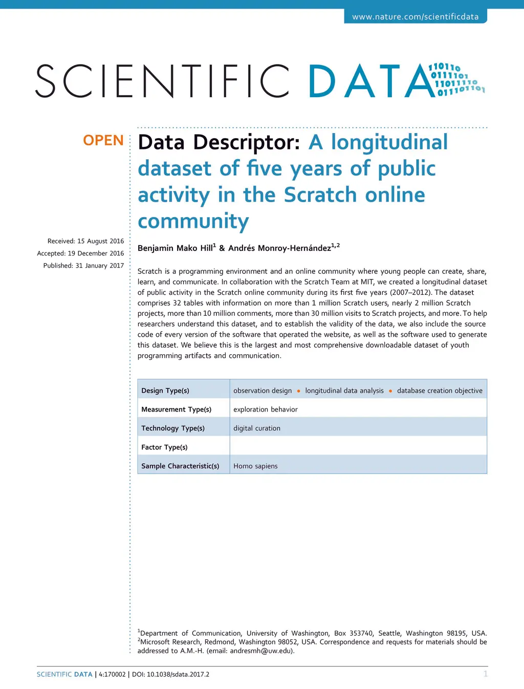 Scratch is a programming environment and an online community where young people can create, share, learn, and communicate. In collaboration with the Scratch Team at MIT, we created a longitudinal dataset of public activity in the Scratch online community during its first five years (2007-2012). The dataset comprises 32 tables with information on more than 1 million Scratch users, nearly 2 million Scratch projects, more than 10 million comments, more than 30 million visits to Scratch projects, and more. To help researchers understand this dataset, and to establish the validity of the data, we also include the source code of every version of the software that operated the website, as well as the software used to generate this dataset. We believe this is the largest and most comprehensive downloadable dataset of youth programming artifacts and communication.