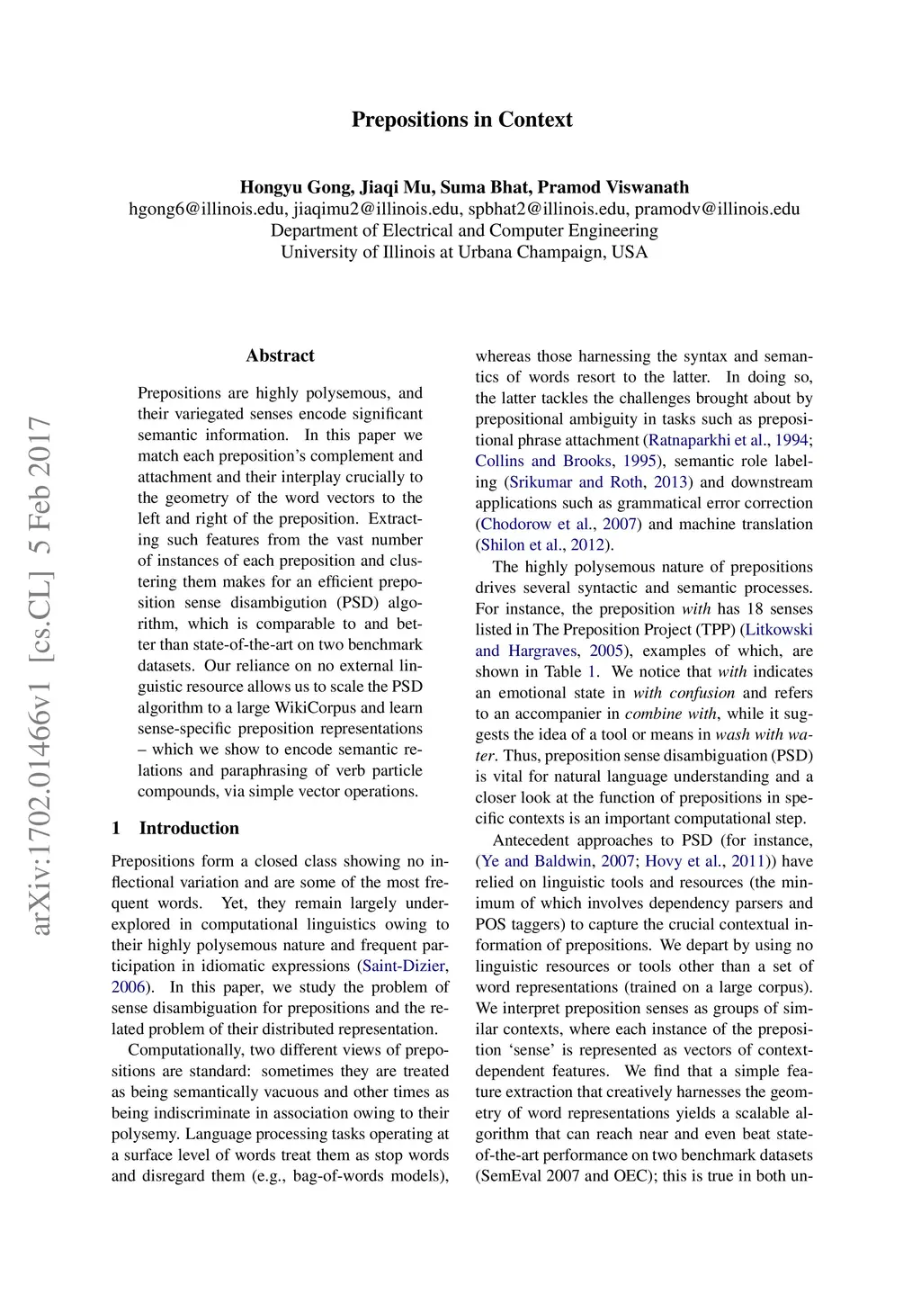 Prepositions are highly polysemous, and their variegated senses encode significant semantic information. In this paper we match each preposition's complement and attachment and their interplay crucially to the geometry of the word vectors to the left and right of the preposition. Extracting such features from the vast number of instances of each preposition and clustering them makes for an efficient preposition sense disambigution (PSD) algorithm, which is comparable to and better than state-of-the-art on two benchmark datasets. Our reliance on no external linguistic resource allows us to scale the PSD algorithm to a large WikiCorpus and learn sense-specific preposition representations -- which we show to encode semantic relations and paraphrasing of verb particle compounds, via simple vector operations.