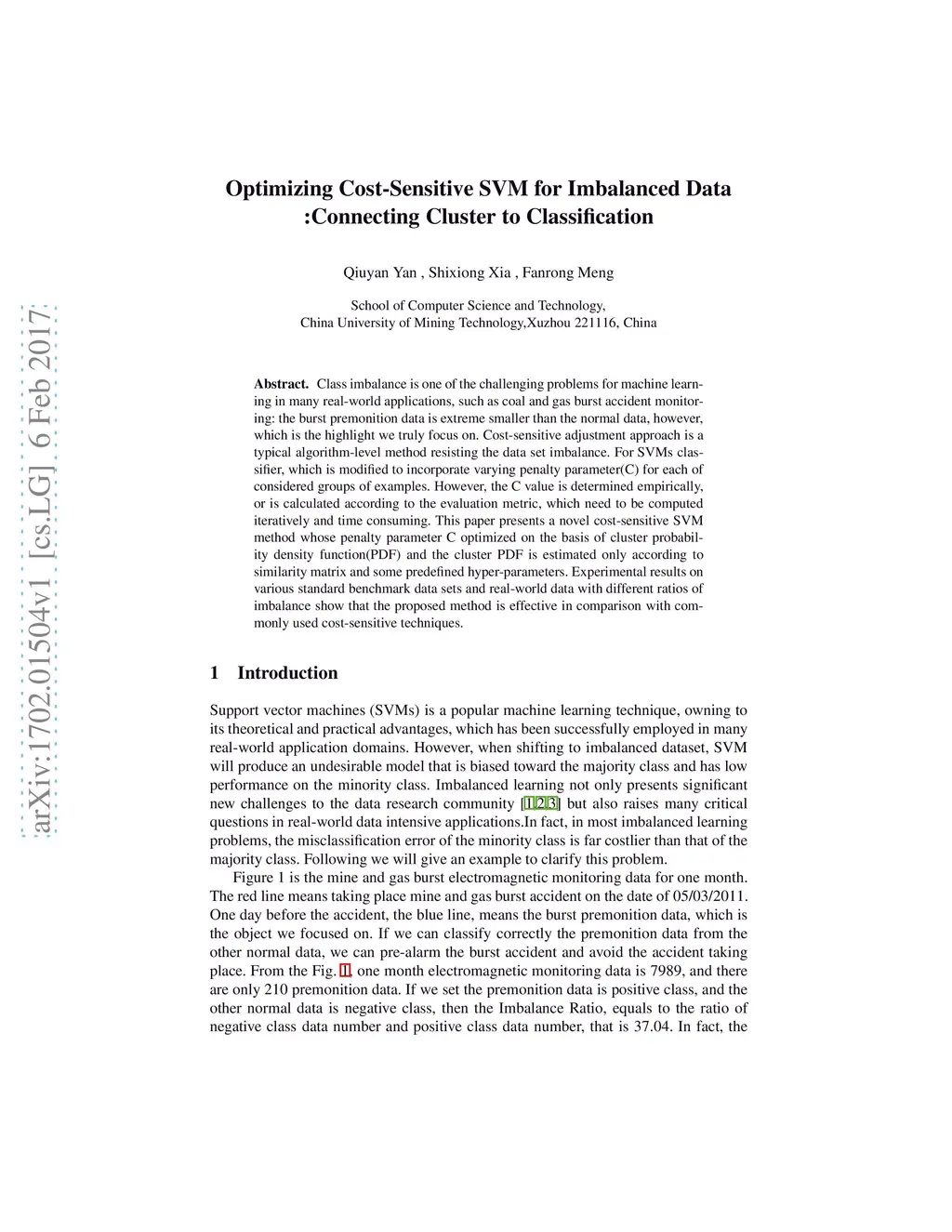 Class imbalance is one of the challenging problems for machine learning in many real-world applications, such as coal and gas burst accident monitoring: the burst premonition data is extreme smaller than the normal data, however, which is the highlight we truly focus on. Cost-sensitive adjustment approach is a typical algorithm-level method resisting the data set imbalance. For SVMs classifier, which is modified to incorporate varying penalty parameter(C) for each of considered groups of examples. However, the C value is determined empirically, or is calculated according to the evaluation metric, which need to be computed iteratively and time consuming. This paper presents a novel cost-sensitive SVM method whose penalty parameter C optimized on the basis of cluster probability density function(PDF) and the cluster PDF is estimated only according to similarity matrix and some predefined hyper-parameters. Experimental results on various standard benchmark data sets and real-world data with different ratios of imbalance show that the proposed method is effective in comparison with commonly used cost-sensitive techniques.