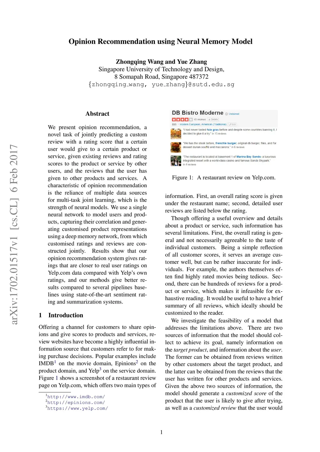 We present opinion recommendation, a novel task of jointly predicting a custom review with a rating score that a certain user would give to a certain product or service, given existing reviews and rating scores to the product or service by other users, and the reviews that the user has given to other products and services. A characteristic of opinion recommendation is the reliance of multiple data sources for multi-task joint learning, which is the strength of neural models. We use a single neural network to model users and products, capturing their correlation and generating customised product representations using a deep memory network, from which customised ratings and reviews are constructed jointly. Results show that our opinion recommendation system gives ratings that are closer to real user ratings on Yelp.com data compared with Yelp's own ratings, and our methods give better results compared to several pipelines baselines using state-of-the-art sentiment rating and summarization systems.