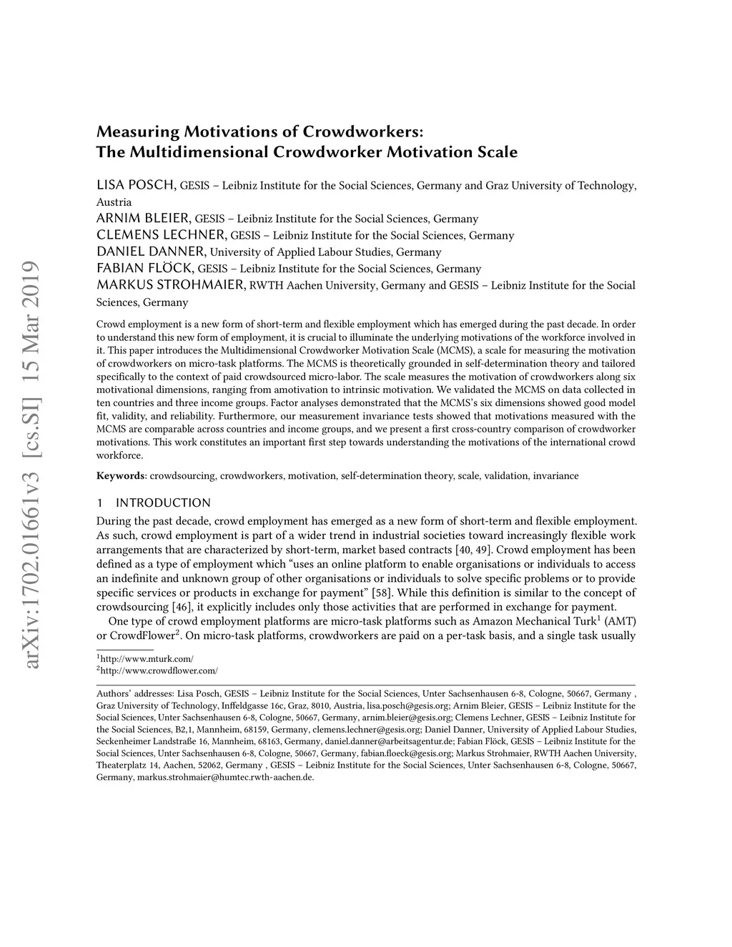 Crowd employment is a new form of short-term and flexible employment which has emerged during the past decade. In order to understand this new form of employment, it is crucial to illuminate the underlying motivations of the workforce involved in it. This paper introduces the Multidimensional Crowdworker Motivation Scale (MCMS), a scale for measuring the motivation of crowdworkers on micro-task platforms. The MCMS is theoretically grounded in self-determination theory and tailored specifically to the context of paid crowdsourced micro-labor. The scale measures the motivation of crowdworkers along six motivational dimensions, ranging from amotivation to intrinsic motivation. We validated the MCMS on data collected in ten countries and three income groups. Factor analyses demonstrated that the MCMS's six dimensions showed good model fit, validity, and reliability. Furthermore, our measurement invariance tests showed that motivations measured with the MCMS are comparable across countries and income groups, and we present a first cross-country comparison of crowdworker motivations. This work constitutes an important first step towards understanding the motivations of the international crowd workforce.
