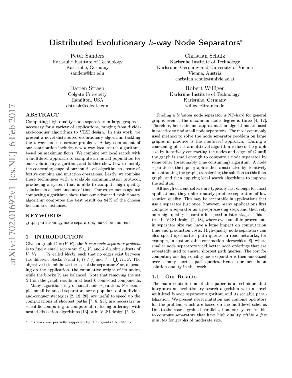 Computing high quality node separators in large graphs is necessary for a variety of applications, ranging from divide-and-conquer algorithms to VLSI design. In this work, we present a novel distributed evolutionary algorithm tackling the k-way node separator problem. A key component of our contribution includes new k-way local search algorithms based on maximum flows. We combine our local search with a multilevel approach to compute an initial population for our evolutionary algorithm, and further show how to modify the coarsening stage of our multilevel algorithm to create effective combine and mutation operations. Lastly, we combine these techniques with a scalable communication protocol, producing a system that is able to compute high quality solutions in a short amount of time. Our experiments against competing algorithms show that our advanced evolutionary algorithm computes the best result on 94% of the chosen benchmark instances.