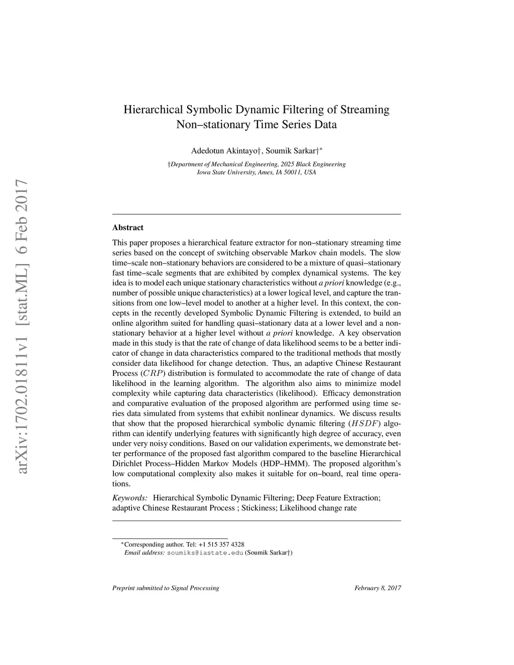 This paper proposes a hierarchical feature extractor for non-stationary streaming time series based on the concept of switching observable Markov chain models. The slow time-scale non-stationary behaviors are considered to be a mixture of quasi-stationary fast time-scale segments that are exhibited by complex dynamical systems. The idea is to model each unique stationary characteristic without a priori knowledge (e.g., number of possible unique characteristics) at a lower logical level, and capture the transitions from one low-level model to another at a higher level. In this context, the concepts in the recently developed Symbolic Dynamic Filtering (SDF) is extended, to build an online algorithm suited for handling quasi-stationary data at a lower level and a non-stationary behavior at a higher level without a priori knowledge. A key observation made in this study is that the rate of change of data likelihood seems to be a better indicator of change in data characteristics compared to the traditional methods that mostly consider data likelihood for change detection. The algorithm minimizes model complexity and captures data likelihood. Efficacy demonstration and comparative evaluation of the proposed algorithm are performed using time series data simulated from systems that exhibit nonlinear dynamics. We discuss results that show that the proposed hierarchical SDF algorithm can identify underlying features with significantly high degree of accuracy, even under very noisy conditions. Algorithm is demonstrated to perform better than the baseline Hierarchical Dirichlet Process-Hidden Markov Models (HDP-HMM). The low computational complexity of algorithm makes it suitable for on-board, real time operations.