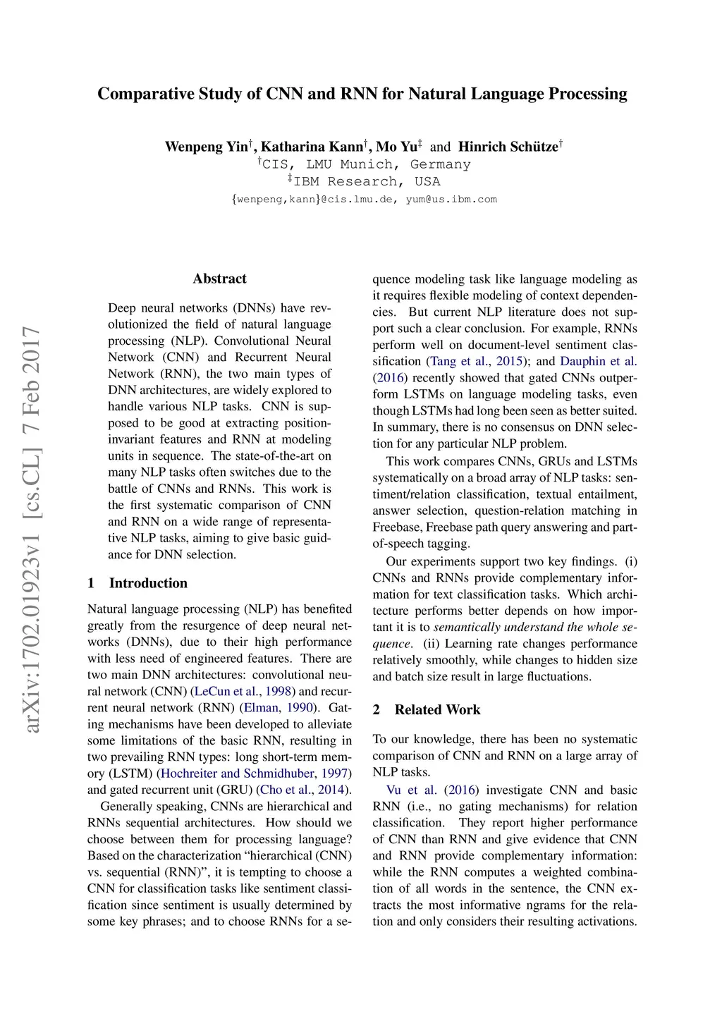 Deep neural networks (DNN) have revolutionized the field of natural language processing (NLP). Convolutional neural network (CNN) and recurrent neural network (RNN), the two main types of DNN architectures, are widely explored to handle various NLP tasks. CNN is supposed to be good at extracting position-invariant features and RNN at modeling units in sequence. The state of the art on many NLP tasks often switches due to the battle between CNNs and RNNs. This work is the first systematic comparison of CNN and RNN on a wide range of representative NLP tasks, aiming to give basic guidance for DNN selection.