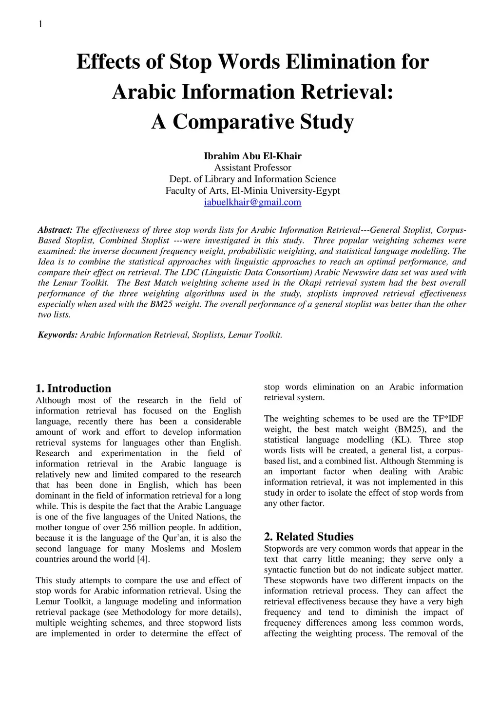 Effects of Stop Words Elimination for Arabic Information Retrieval: A