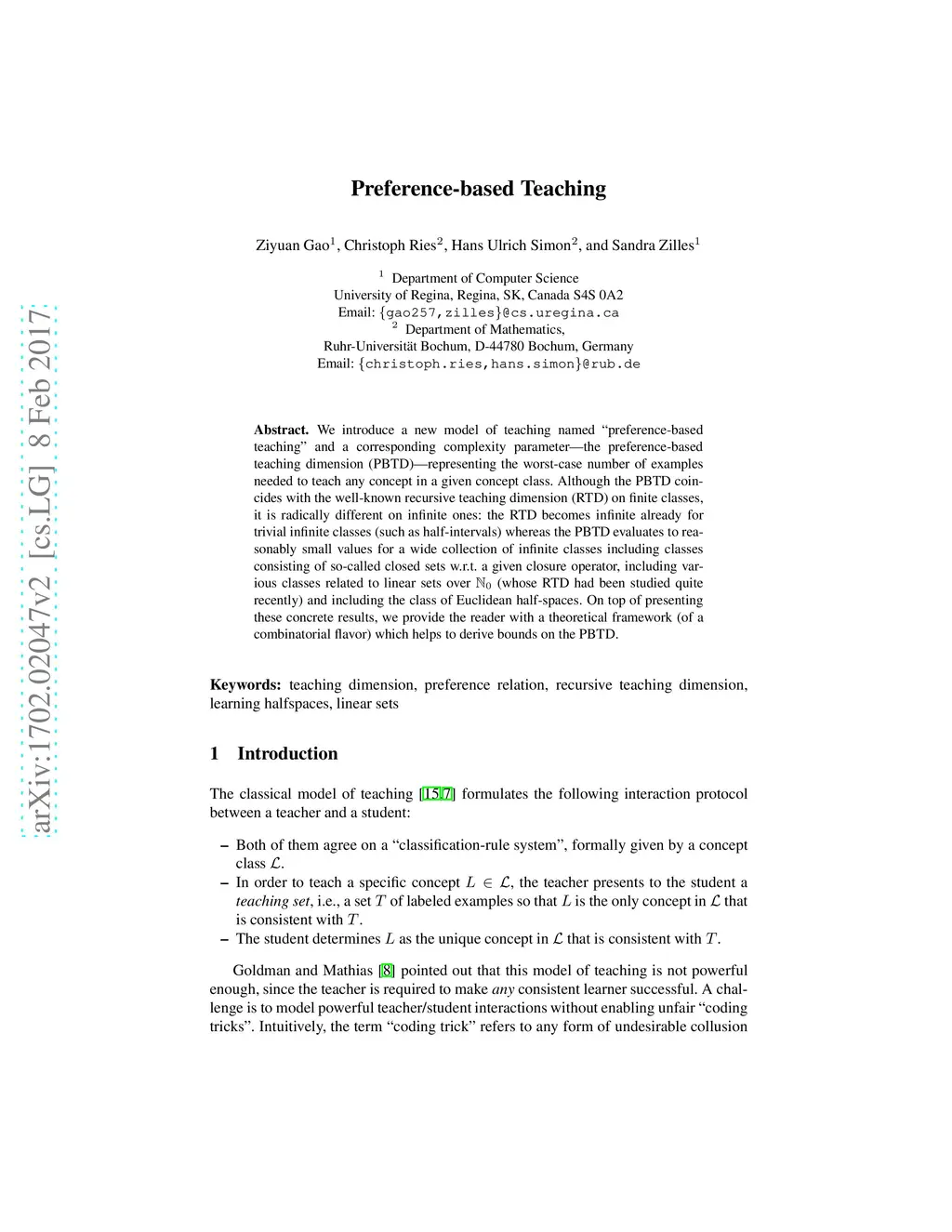 We introduce a new model of teaching named "preference-based teaching" and a corresponding complexity parameter---the preference-based teaching dimension (PBTD)---representing the worst-case number of examples needed to teach any concept in a given concept class. Although the PBTD coincides with the well-known recursive teaching dimension (RTD) on finite classes, it is radically different on infinite ones: the RTD becomes infinite already for trivial infinite classes (such as half-intervals) whereas the PBTD evaluates to reasonably small values for a wide collection of infinite classes including classes consisting of so-called closed sets w.r.t. a given closure operator, including various classes related to linear sets over (whose RTD had been studied quite recently) and including the class of Euclidean half-spaces. On top of presenting these concrete results, we provide the reader with a theoretical framework (of a combinatorial flavor) which helps to derive bounds on the PBTD.
