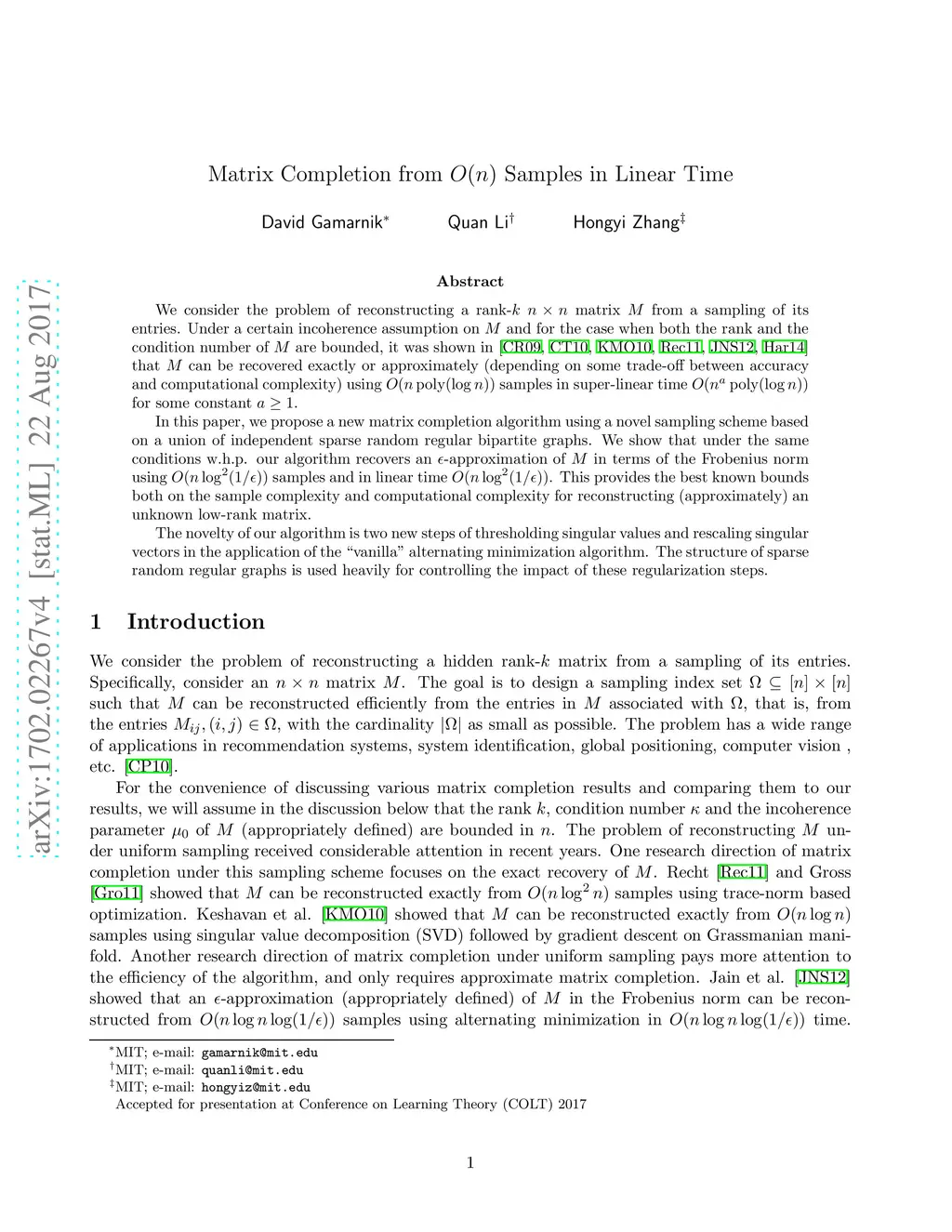 We consider the problem of reconstructing a rank- matrix from a sampling of its entries. Under a certain incoherence assumption on and for the case when both the rank and the condition number of are bounded, it was shown in \cite{CandesRecht2009, CandesTao2010, keshavan2010, Recht2011, Jain2012, Hardt2014} that can be recovered exactly or approximately (depending on some trade-off between accuracy and computational complexity) using samples in super-linear time for some constant . In this paper, we propose a new matrix completion algorithm using a novel sampling scheme based on a union of independent sparse random regular bipartite graphs. We show that under the same conditions w.h.p. our algorithm recovers an -approximation of in terms of the Frobenius norm using samples and in linear time . This provides the best known bounds both on the sample complexity and computational complexity for reconstructing (approximately) an unknown low-rank matrix. The novelty of our algorithm is two new steps of thresholding singular values and rescaling singular vectors in the application of the "vanilla" alternating minimization algorithm. The structure of sparse random regular graphs is used heavily for controlling the impact of these regularization steps.