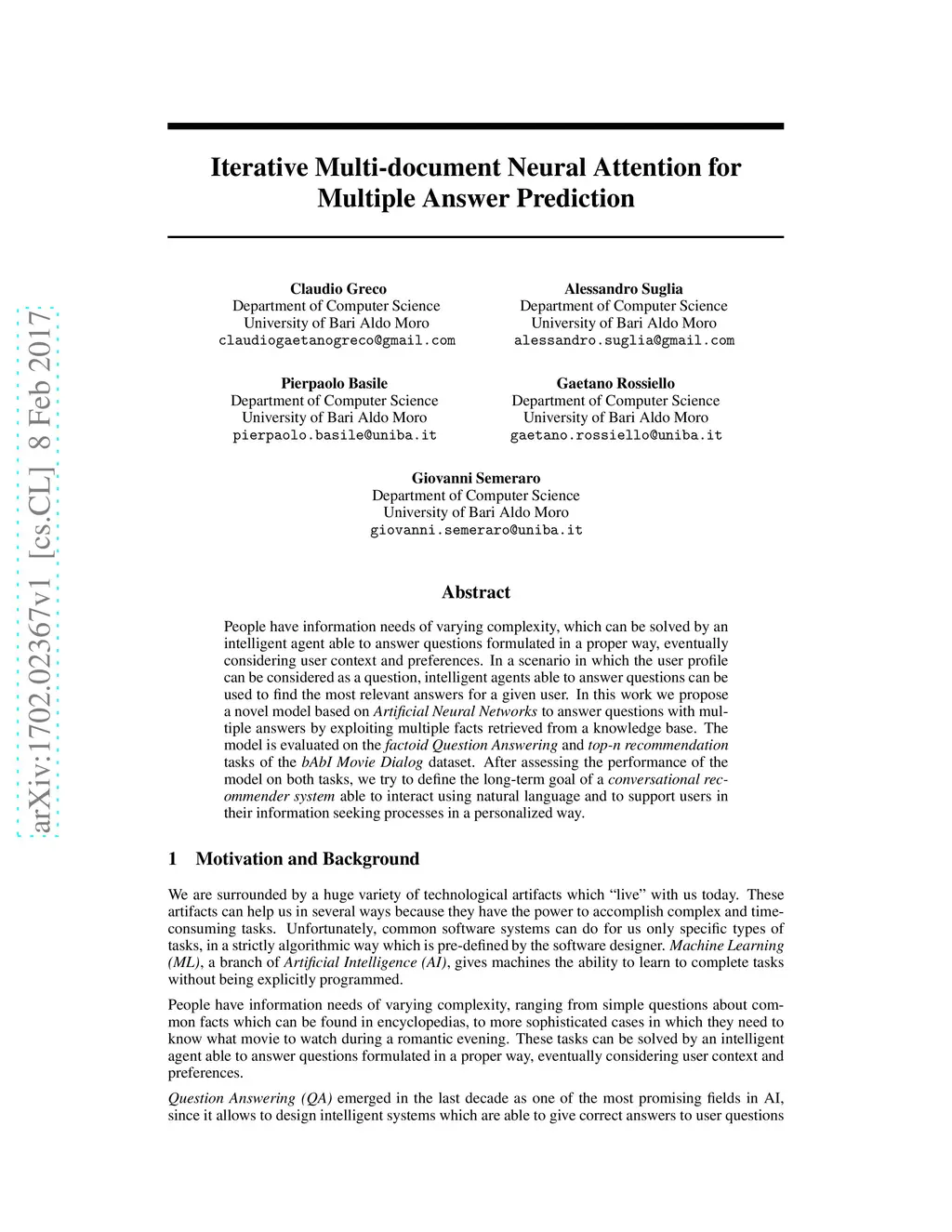 People have information needs of varying complexity, which can be solved by an intelligent agent able to answer questions formulated in a proper way, eventually considering user context and preferences. In a scenario in which the user profile can be considered as a question, intelligent agents able to answer questions can be used to find the most relevant answers for a given user. In this work we propose a novel model based on Artificial Neural Networks to answer questions with multiple answers by exploiting multiple facts retrieved from a knowledge base. The model is evaluated on the factoid Question Answering and top-n recommendation tasks of the bAbI Movie Dialog dataset. After assessing the performance of the model on both tasks, we try to define the long-term goal of a conversational recommender system able to interact using natural language and to support users in their information seeking processes in a personalized way.