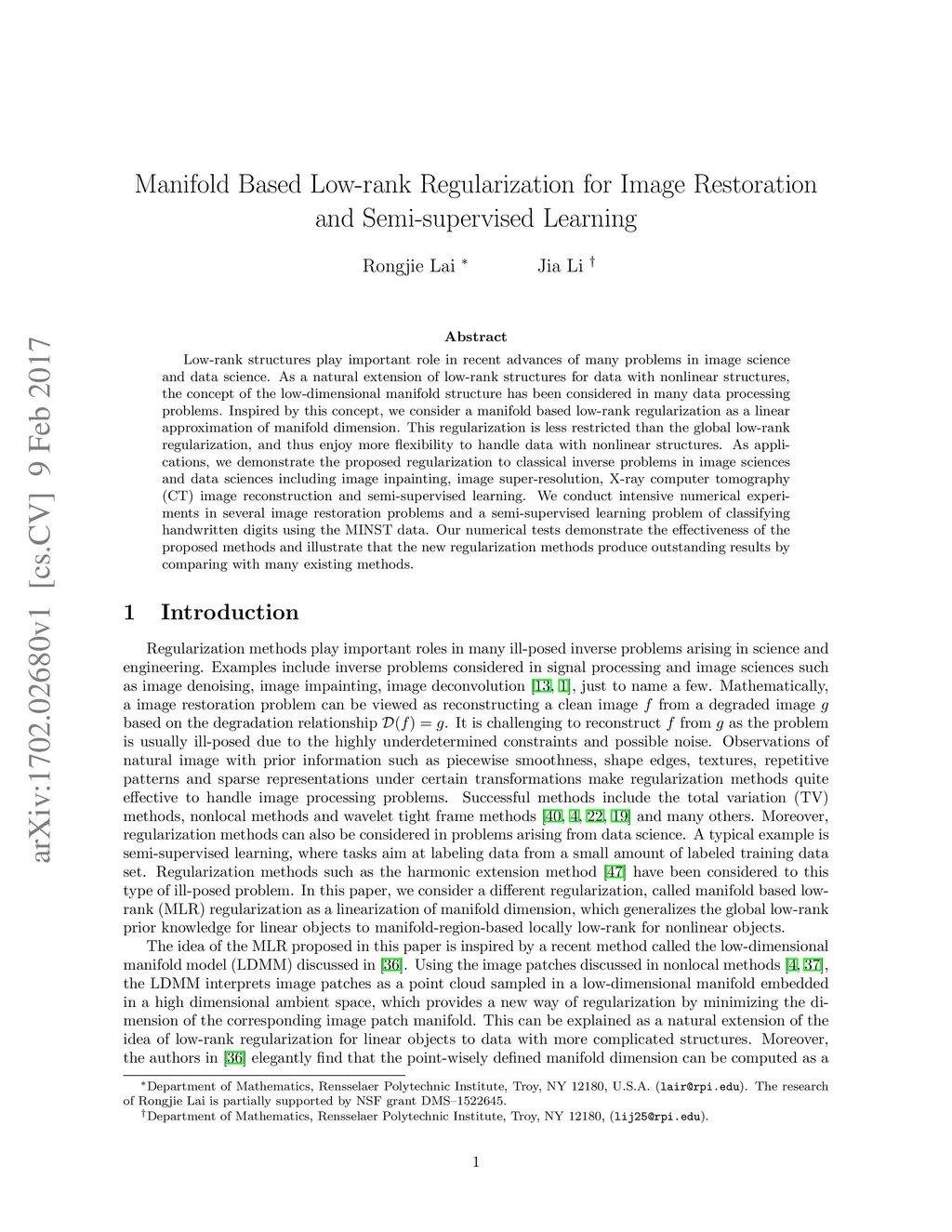 Low-rank structures play important role in recent advances of many problems in image science and data science. As a natural extension of low-rank structures for data with nonlinear structures, the concept of the low-dimensional manifold structure has been considered in many data processing problems. Inspired by this concept, we consider a manifold based low-rank regularization as a linear approximation of manifold dimension. This regularization is less restricted than the global low-rank regularization, and thus enjoy more flexibility to handle data with nonlinear structures. As applications, we demonstrate the proposed regularization to classical inverse problems in image sciences and data sciences including image inpainting, image super-resolution, X-ray computer tomography (CT) image reconstruction and semi-supervised learning. We conduct intensive numerical experiments in several image restoration problems and a semi-supervised learning problem of classifying handwritten digits using the MINST data. Our numerical tests demonstrate the effectiveness of the proposed methods and illustrate that the new regularization methods produce outstanding results by comparing with many existing methods.