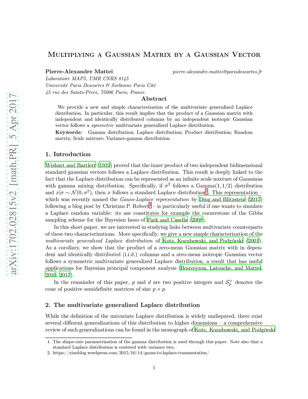 We provide a new and simple characterization of the multivariate generalized Laplace distribution. In particular, this result implies that the product of a Gaussian matrix with independent and identically distributed columns by an independent isotropic Gaussian vector follows a symmetric multivariate generalized Laplace distribution.