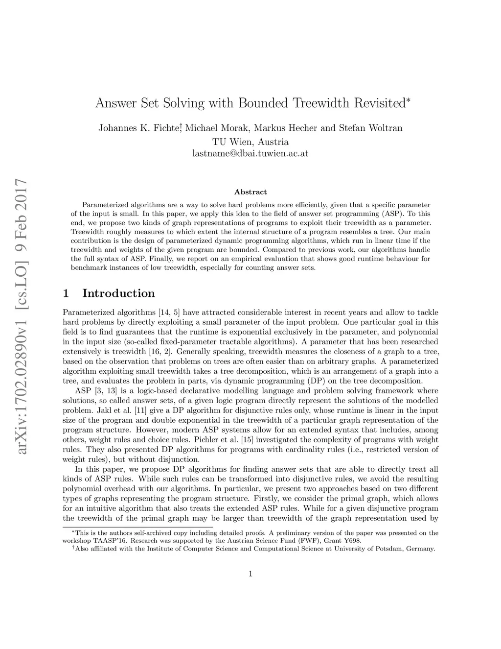 Answer Set Solving with Bounded Treewidth Revisited