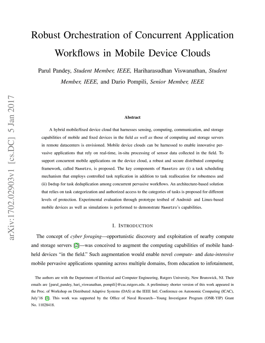 A hybrid mobile/fixed device cloud that harnesses sensing, computing, communication, and storage capabilities of mobile and fixed devices in the field as well as those of computing and storage servers in remote datacenters is envisioned. Mobile device clouds can be harnessed to enable innovative pervasive applications that rely on real-time, in-situ processing of sensor data collected in the field. To support concurrent mobile applications on the device cloud, a robust and secure distributed computing framework, called Maestro, is proposed. The key components of Maestro are (i) a task scheduling mechanism that employs controlled task replication in addition to task reallocation for robustness and (ii) Dedup for task deduplication among concurrent pervasive workflows. An architecture-based solution that relies on task categorization and authorized access to the categories of tasks is proposed for different levels of protection. Experimental evaluation through prototype testbed of Android- and Linux-based mobile devices as well as simulations is performed to demonstrate Maestro's capabilities.