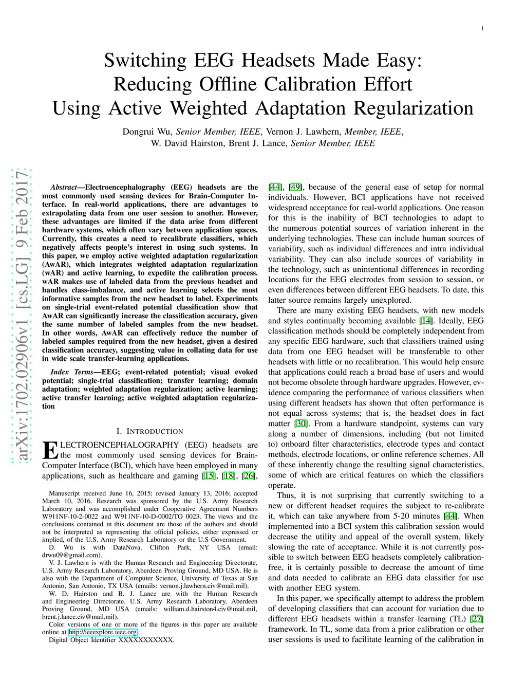 Electroencephalography (EEG) headsets are the most commonly used sensing devices for Brain-Computer Interface. In real-world applications, there are advantages to extrapolating data from one user session to another. However, these advantages are limited if the data arise from different hardware systems, which often vary between application spaces. Currently, this creates a need to recalibrate classifiers, which negatively affects people's interest in using such systems. In this paper, we employ active weighted adaptation regularization (AwAR), which integrates weighted adaptation regularization (wAR) and active learning, to expedite the calibration process. wAR makes use of labeled data from the previous headset and handles class-imbalance, and active learning selects the most informative samples from the new headset to label. Experiments on single-trial event-related potential classification show that AwAR can significantly increase the classification accuracy, given the same number of labeled samples from the new headset. In other words, AwAR can effectively reduce the number of labeled samples required from the new headset, given a desired classification accuracy, suggesting value in collating data for use in wide scale transfer-learning applications.