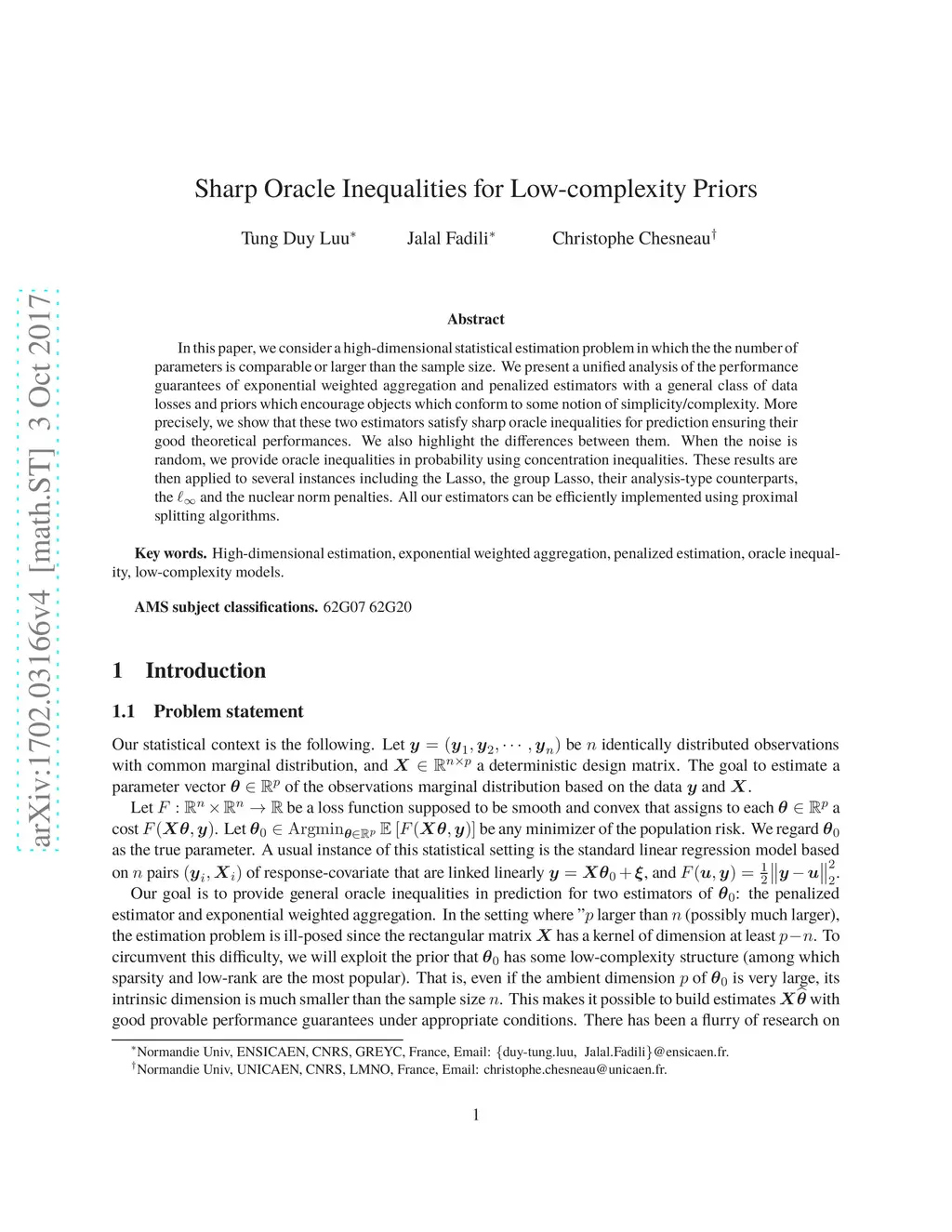 In this paper,we consider a high-dimensional statistical estimation problem in which the the number of parameters is comparable or larger than the sample size. We present a unified analysis of the performance guarantees of exponential weighted aggregation and penalized estimators with a general class of data losses and priors which encourage objects which conform to some notion of simplicity/complexity. More precisely, we show that these two estimators satisfy sharp oracle inequalities for prediction ensuring their good theoretical performances. We also highlight the differences between them. When the noise is random, we provide oracle inequalities in probability using concentration inequalities. These results are then applied to several instances including the Lasso, the group Lasso, their analysis-type counterparts, the and the nuclear norm penalties. All our estimators can be efficiently implemented using proximal splitting algorithms.