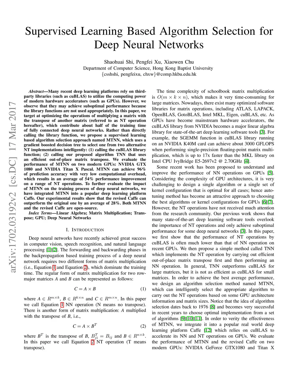Many recent deep learning platforms rely on third-party libraries (such as cuBLAS) to utilize the computing power of modern hardware accelerators (such as GPUs). However, we observe that they may achieve suboptimal performance because the library functions are not used appropriately. In this paper, we target at optimizing the operations of multiplying a matrix with the transpose of another matrix (referred to as NT operation hereafter), which contribute about half of the training time of fully connected deep neural networks. Rather than directly calling the library function, we propose a supervised learning based algorithm selection approach named MTNN, which uses a gradient boosted decision tree to select one from two alternative NT implementations intelligently: (1) calling the cuBLAS library function; (2) calling our proposed algorithm TNN that uses an efficient out-of-place matrix transpose. We evaluate the performance of MTNN on two modern GPUs: NVIDIA GTX 1080 and NVIDIA Titan X Pascal. MTNN can achieve 96\% of prediction accuracy with very low computational overhead, which results in an average of 54\% performance improvement on a range of NT operations. To further evaluate the impact of MTNN on the training process of deep neural networks, we have integrated MTNN into a popular deep learning platform Caffe. Our experimental results show that the revised Caffe can outperform the original one by an average of 28\%. Both MTNN and the revised Caffe are open-source.
