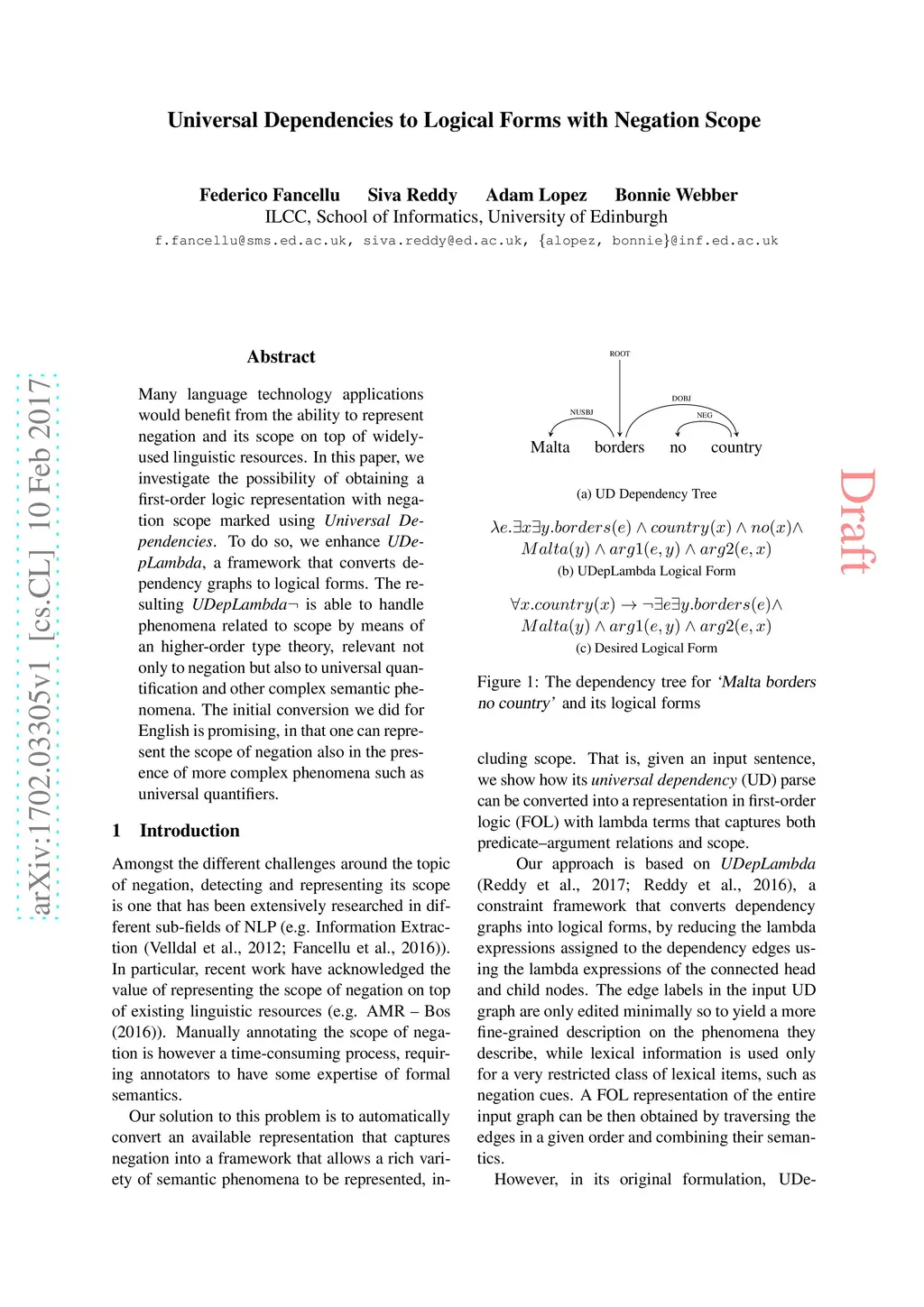 Many language technology applications would benefit from the ability to represent negation and its scope on top of widely-used linguistic resources. In this paper, we investigate the possibility of obtaining a first-order logic representation with negation scope marked using Universal Dependencies. To do so, we enhance UDepLambda, a framework that converts dependency graphs to logical forms. The resulting UDepLambda is able to handle phenomena related to scope by means of an higher-order type theory, relevant not only to negation but also to universal quantification and other complex semantic phenomena. The initial conversion we did for English is promising, in that one can represent the scope of negation also in the presence of more complex phenomena such as universal quantifiers.