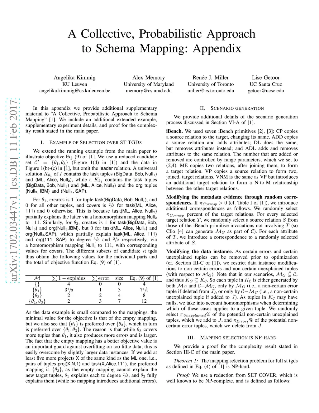 In this appendix we provide additional supplementary material to "A Collective, Probabilistic Approach to Schema Mapping." We include an additional extended example, supplementary experiment details, and proof for the complexity result stated in the main paper.