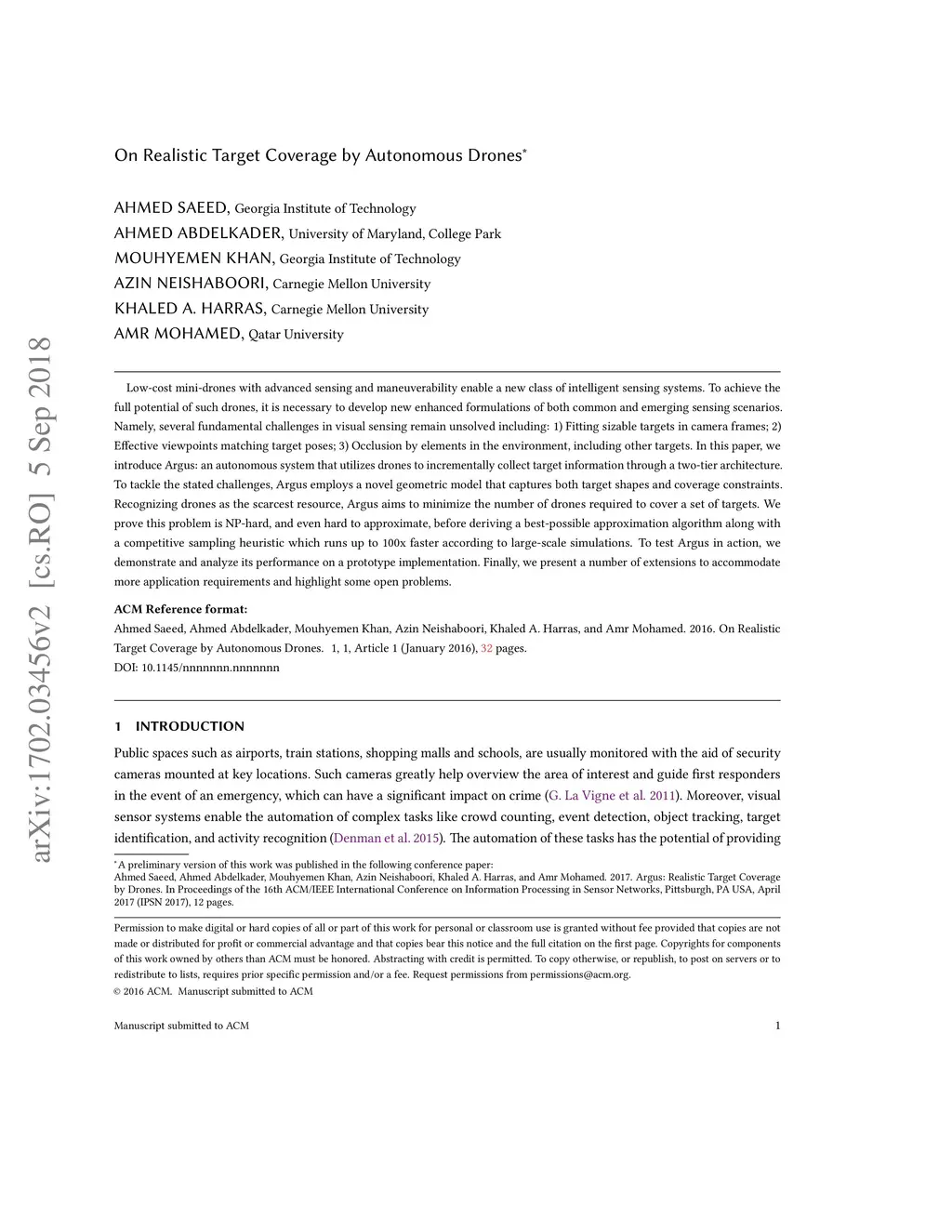 Low-cost mini-drones with advanced sensing and maneuverability enable a new class of intelligent sensing systems. To achieve the full potential of such drones, it is necessary to develop new enhanced formulations of both common and emerging sensing scenarios. Namely, several fundamental challenges in visual sensing remain unsolved including: 1) Fitting sizable targets in camera frames; 2) Effective viewpoints matching target poses; 3) Occlusion by elements in the environment, including other targets. In this paper, we introduce Argus: an autonomous system that utilizes drones to incrementally collect target information through a two-tier architecture. To tackle the stated challenges, Argus employs a novel geometric model that captures both target shapes and coverage constraints. Recognizing drones as the scarcest resource, Argus aims to minimize the number of drones required to cover a set of targets. We prove this problem is NP-hard, and even hard to approximate, before deriving a best-possible approximation algorithm along with a competitive sampling heuristic which runs up to 100x faster according to large-scale simulations. To test Argus in action, we demonstrate and analyze its performance on a prototype implementation. Finally, we present a number of extensions to accommodate more application requirements and highlight some open problems.