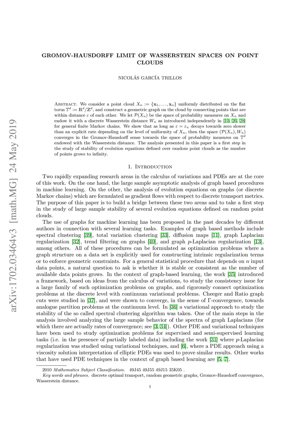 We consider a point cloud uniformly distributed on the flat torus $\mathbb{T}^d : = \mathbb{R}^d / \mathbb{Z}^d $, and construct a geometric graph on the cloud by connecting points that are within distance of each other. We let be the space of probability measures on and endow it with a discrete Wasserstein distance as introduced independently by Maas and Zhou et al. for general finite Markov chains. We show that as long as decays towards zero slower than an explicit rate depending on the level of uniformity of , then the space converges in the Gromov-Hausdorff sense towards the space of probability measures on endowed with the Wasserstein distance.