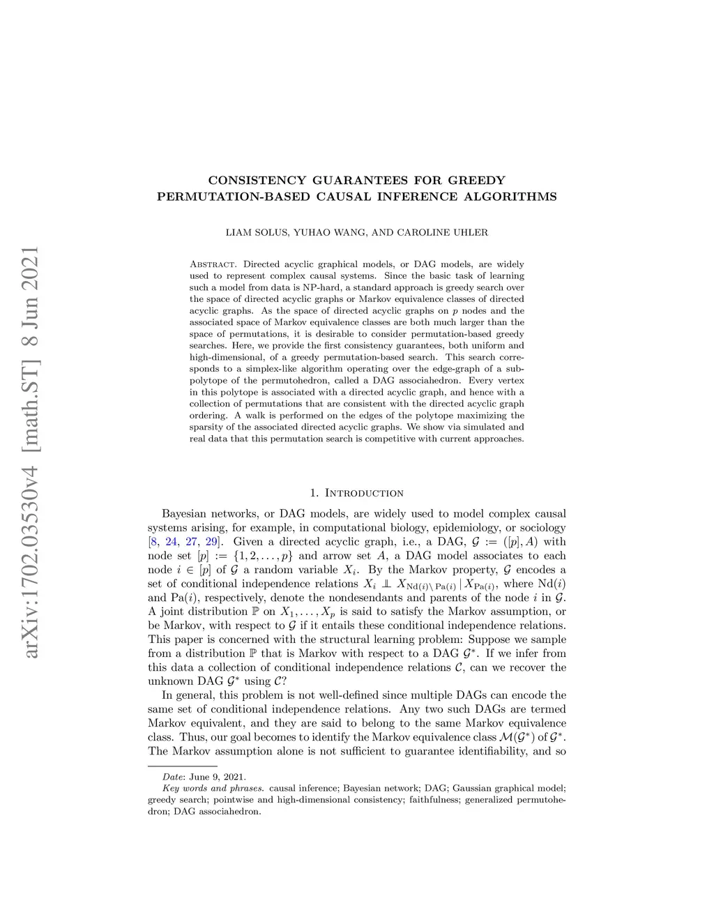 Bayesian networks, or directed acyclic graph (DAG) models, are widely used to represent complex causal systems. Since the basic task of learning a Bayesian network from data is NP-hard, a standard approach is greedy search over the space of DAGs or Markov equivalent DAGs. Since the space of DAGs on p nodes and the associated space of Markov equivalence classes are both much larger than the space of permutations, it is desirable to consider permutation-based searches. We here provide the first consistency guarantees, both uniform and high-dimensional, of a permutation-based greedy search. Geometrically, this search corresponds to a simplex-type algorithm on a sub-polytope of the permutohedron, the DAG associahedron. Every vertex in this polytope is associated with a DAG, and hence with a collection of permutations that are consistent with the DAG ordering. A walk is performed on the edges of the polytope maximizing the sparsity of the associated DAGs. We show based on simulations that this permutation search is competitive with standard approaches.