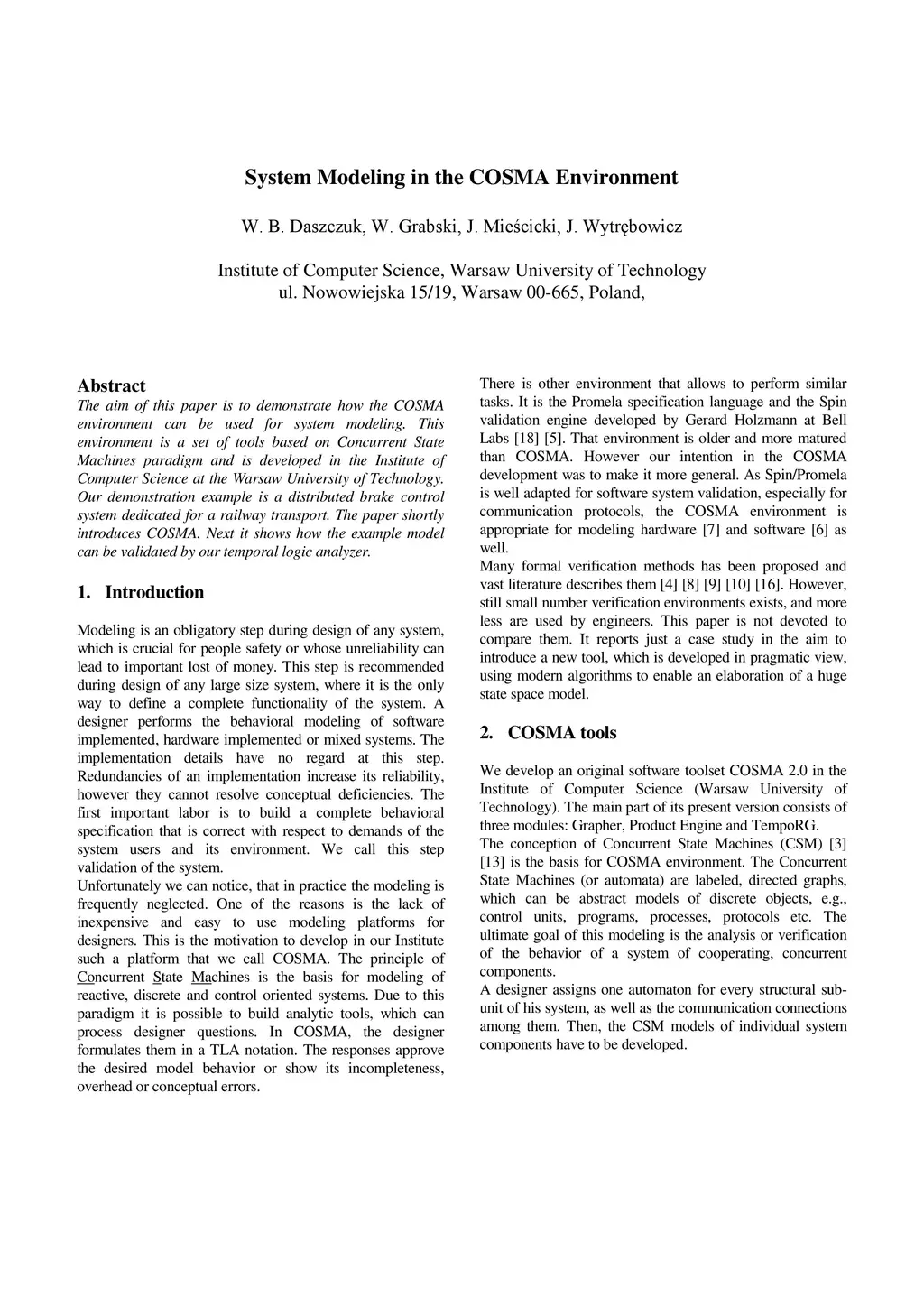 The aim of this paper is to demonstrate how the COSMA environment can be used for system modeling. This environment is a set of tools based on Concurrent State Machines paradigm and is developed in the Institute of Computer Science at the Warsaw University of Technology. Our demonstration example is a distributed brake control system dedicated for a railway transport. The paper shortly introduces COSMA. Next it shows how the example model can be validated by our temporal logic analyzer.