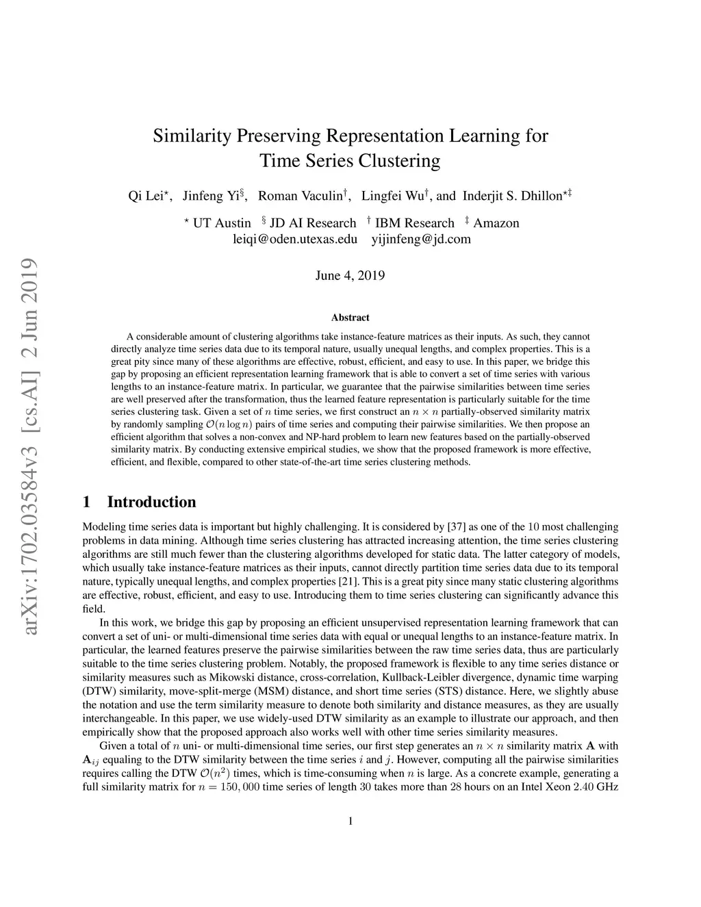 A considerable amount of clustering algorithms take instance-feature matrices as their inputs. As such, they cannot directly analyze time series data due to its temporal nature, usually unequal lengths, and complex properties. This is a great pity since many of these algorithms are effective, robust, efficient, and easy to use. In this paper, we bridge this gap by proposing an efficient representation learning framework that is able to convert a set of time series with various lengths to an instance-feature matrix. In particular, we guarantee that the pairwise similarities between time series are well preserved after the transformation, thus the learned feature representation is particularly suitable for the time series clustering task. Given a set of time series, we first construct an partially-observed similarity matrix by randomly sampling pairs of time series and computing their pairwise similarities. We then propose an efficient algorithm that solves a non-convex and NP-hard problem to learn new features based on the partially-observed similarity matrix. By conducting extensive empirical studies, we show that the proposed framework is more effective, efficient, and flexible, compared to other state-of-the-art time series clustering methods.