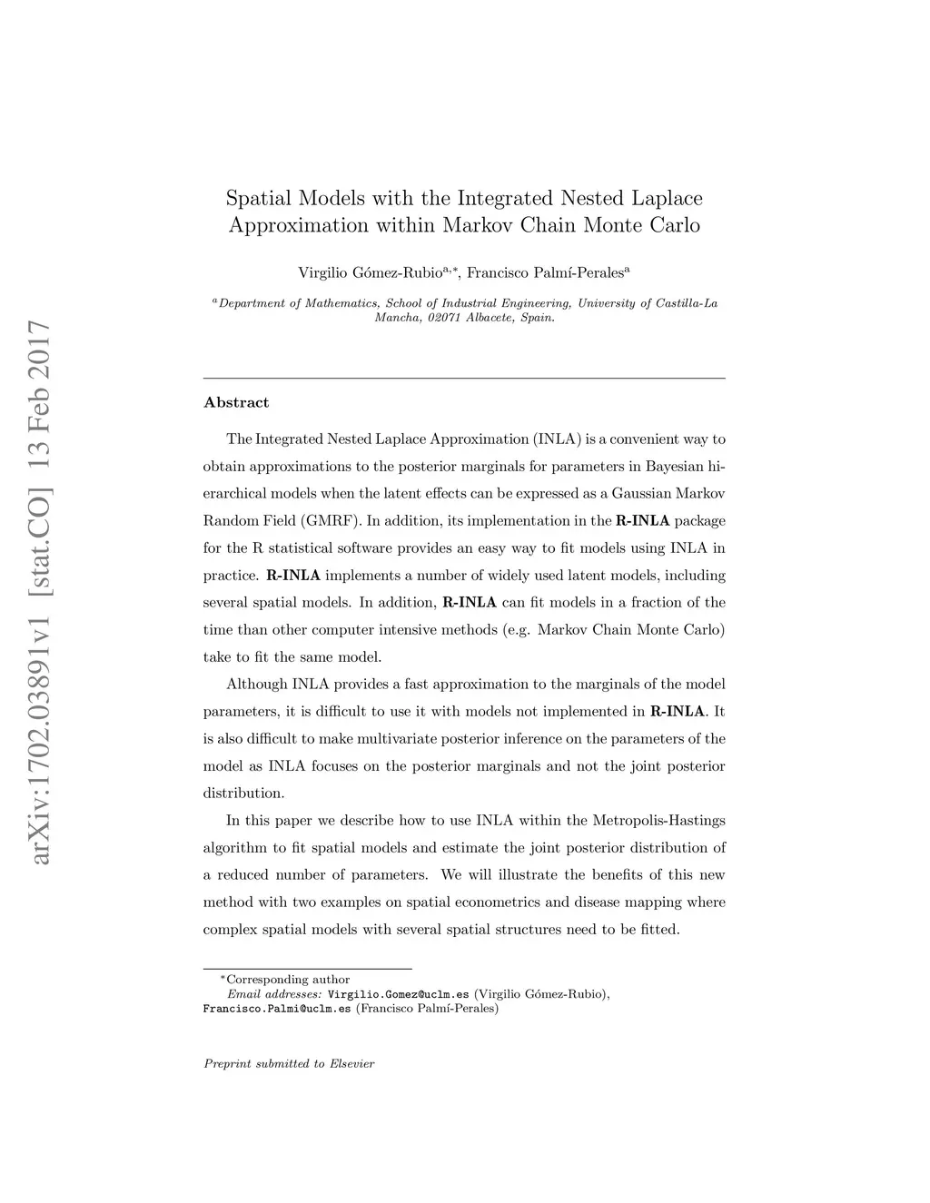 The Integrated Nested Laplace Approximation (INLA) is a convenient way to obtain approximations to the posterior marginals for parameters in Bayesian hierarchical models when the latent effects can be expressed as a Gaussian Markov Random Field (GMRF). In addition, its implementation in the R-INLA package for the R statistical software provides an easy way to fit models using INLA in practice. R-INLA implements a number of widely used latent models, including several spatial models. In addition, R-INLA can fit models in a fraction of the time than other computer intensive methods (e.g. Markov Chain Monte Carlo) take to fit the same model. Although INLA provides a fast approximation to the marginals of the model parameters, it is difficult to use it with models not implemented in R-INLA. It is also difficult to make multivariate posterior inference on the parameters of the model as INLA focuses on the posterior marginals and not the joint posterior distribution. In this paper we describe how to use INLA within the Metropolis-Hastings algorithm to fit spatial models and estimate the joint posterior distribution of a reduced number of parameters. We will illustrate the benefits of this new method with two examples on spatial econometrics and disease mapping where complex spatial models with several spatial structures need to be fitted.