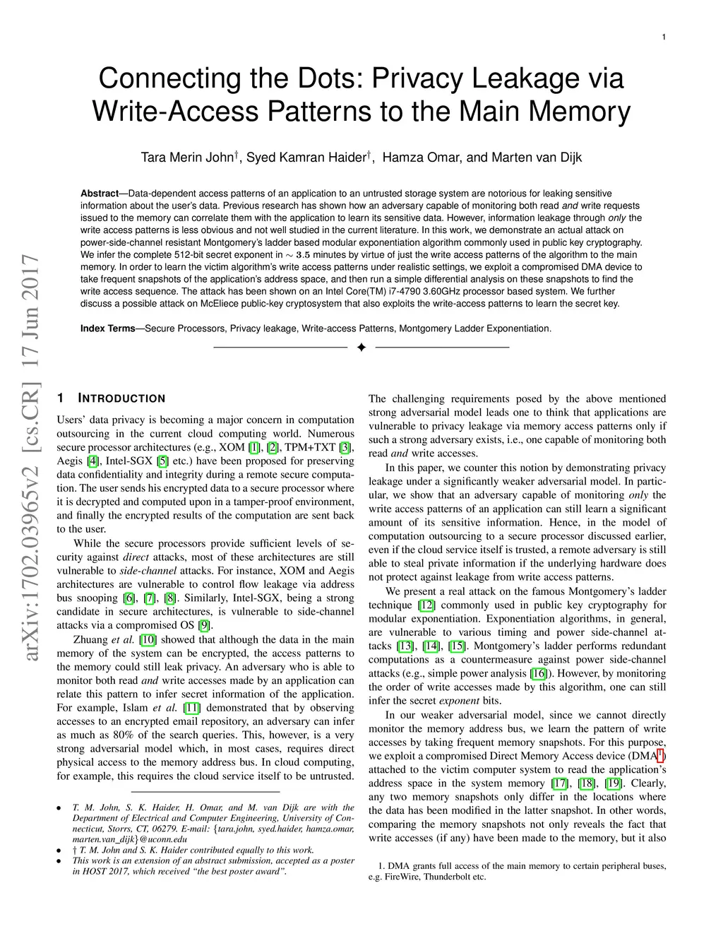 Data-dependent access patterns of an application to an untrusted storage system are notorious for leaking sensitive information about the user's data. Previous research has shown how an adversary capable of monitoring both read and write requests issued to the memory can correlate them with the application to learn its sensitive data. However, information leakage through only the write access patterns is less obvious and not well studied in the current literature. In this work, we demonstrate an actual attack on power-side-channel resistant Montgomery's ladder based modular exponentiation algorithm commonly used in public key cryptography. We infer the complete 512-bit secret exponent in minutes by virtue of just the write access patterns of the algorithm to the main memory. In order to learn the victim algorithm's write access patterns under realistic settings, we exploit a compromised DMA device to take frequent snapshots of the application's address space, and then run a simple differential analysis on these snapshots to find the write access sequence. The attack has been shown on an Intel Core(TM) i7-4790 3.60GHz processor based system. We further discuss a possible attack on McEliece public-key cryptosystem that also exploits the write-access patterns to learn the secret key.