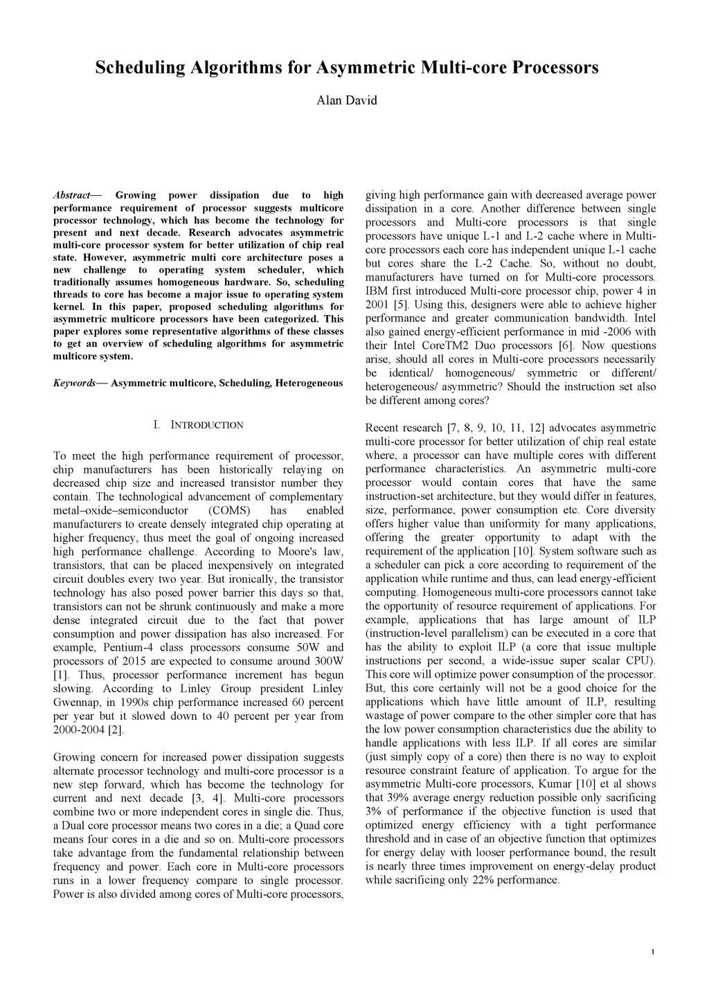 Growing power dissipation due to high performance requirement of processor suggests multicore processor technology, which has become the technology for present and next decade. Research advocates asymmetric multi-core processor system for better utilization of chip real state. However, asymmetric multi core architecture poses a new challenge to operating system scheduler, which traditionally assumes homogeneous hardware. So, scheduling threads to core has become a major issue to operating system kernel. In this paper, proposed scheduling algorithms for asymmetric multicore processors have been categorized. This paper explores some representative algorithms of these classes to get an overview of scheduling algorithms for asymmetric multicore system.
