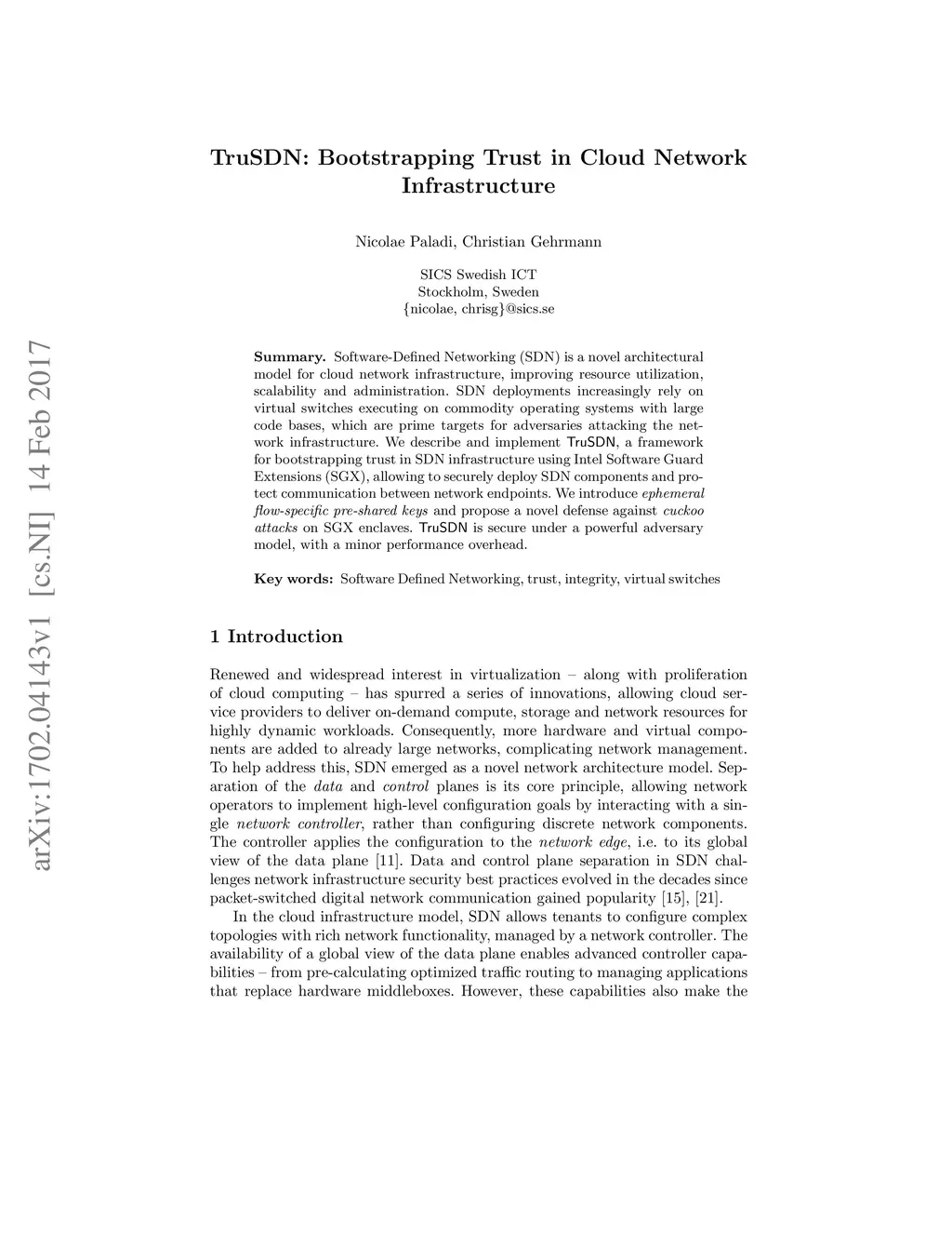 Software-Defined Networking (SDN) is a novel architectural model for cloud network infrastructure, improving resource utilization, scalability and administration. SDN deployments increasingly rely on virtual switches executing on commodity operating systems with large code bases, which are prime targets for adversaries attacking the net- work infrastructure. We describe and implement TruSDN, a framework for bootstrapping trust in SDN infrastructure using Intel Software Guard Extensions (SGX), allowing to securely deploy SDN components and protect communication between network endpoints. We introduce ephemeral flow-specific pre-shared keys and propose a novel defense against cuckoo attacks on SGX enclaves. TruSDN is secure under a powerful adversary model, with a minor performance overhead.