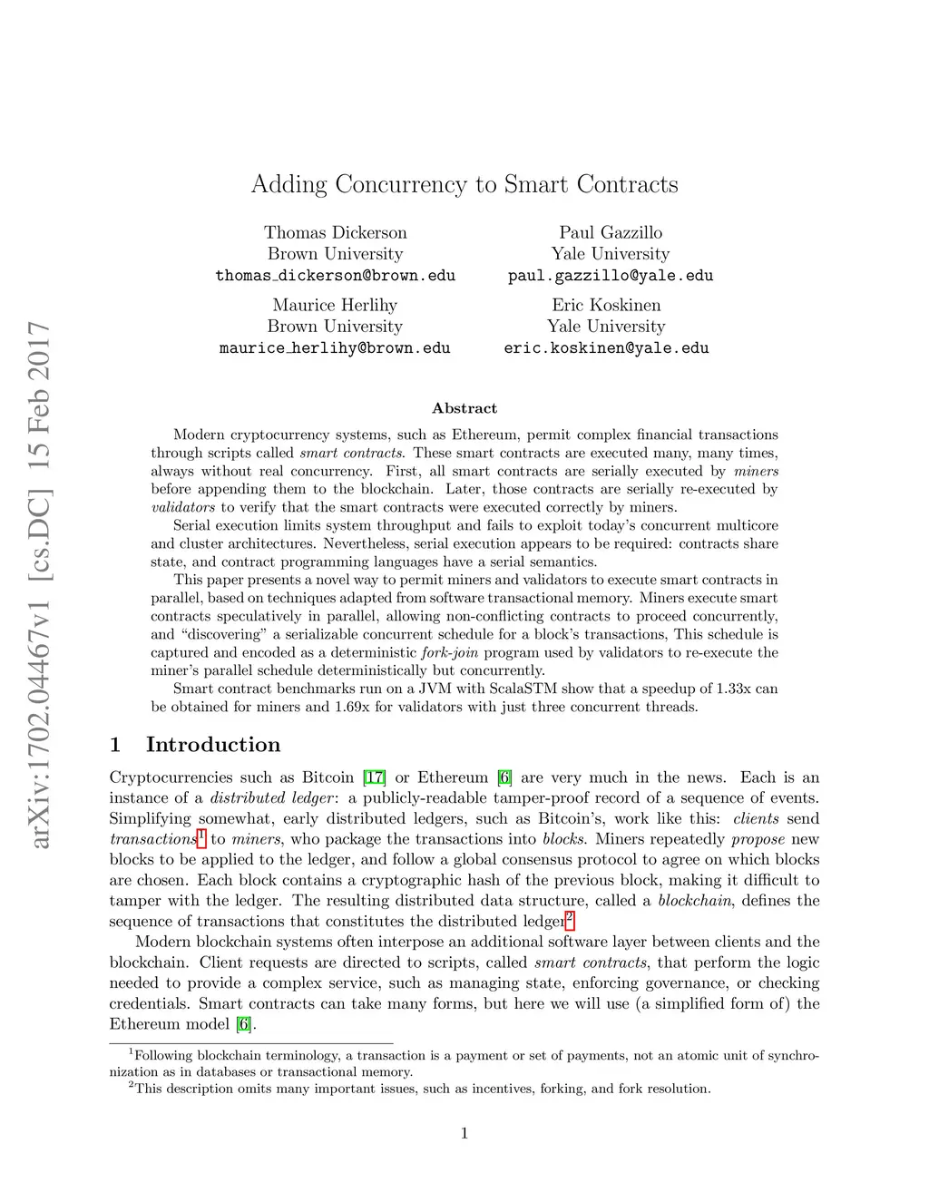Modern cryptocurrency systems, such as Ethereum, permit complex financial transactions through scripts called smart contracts. These smart contracts are executed many, many times, always without real concurrency. First, all smart contracts are serially executed by miners before appending them to the blockchain. Later, those contracts are serially re-executed by validators to verify that the smart contracts were executed correctly by miners. Serial execution limits system throughput and fails to exploit today's concurrent multicore and cluster architectures. Nevertheless, serial execution appears to be required: contracts share state, and contract programming languages have a serial semantics. This paper presents a novel way to permit miners and validators to execute smart contracts in parallel, based on techniques adapted from software transactional memory. Miners execute smart contracts speculatively in parallel, allowing non-conflicting contracts to proceed concurrently, and "discovering" a serializable concurrent schedule for a block's transactions, This schedule is captured and encoded as a deterministic fork-join program used by validators to re-execute the miner's parallel schedule deterministically but concurrently. Smart contract benchmarks run on a JVM with ScalaSTM show that a speedup of of 1.33x can be obtained for miners and 1.69x for validators with just three concurrent threads.