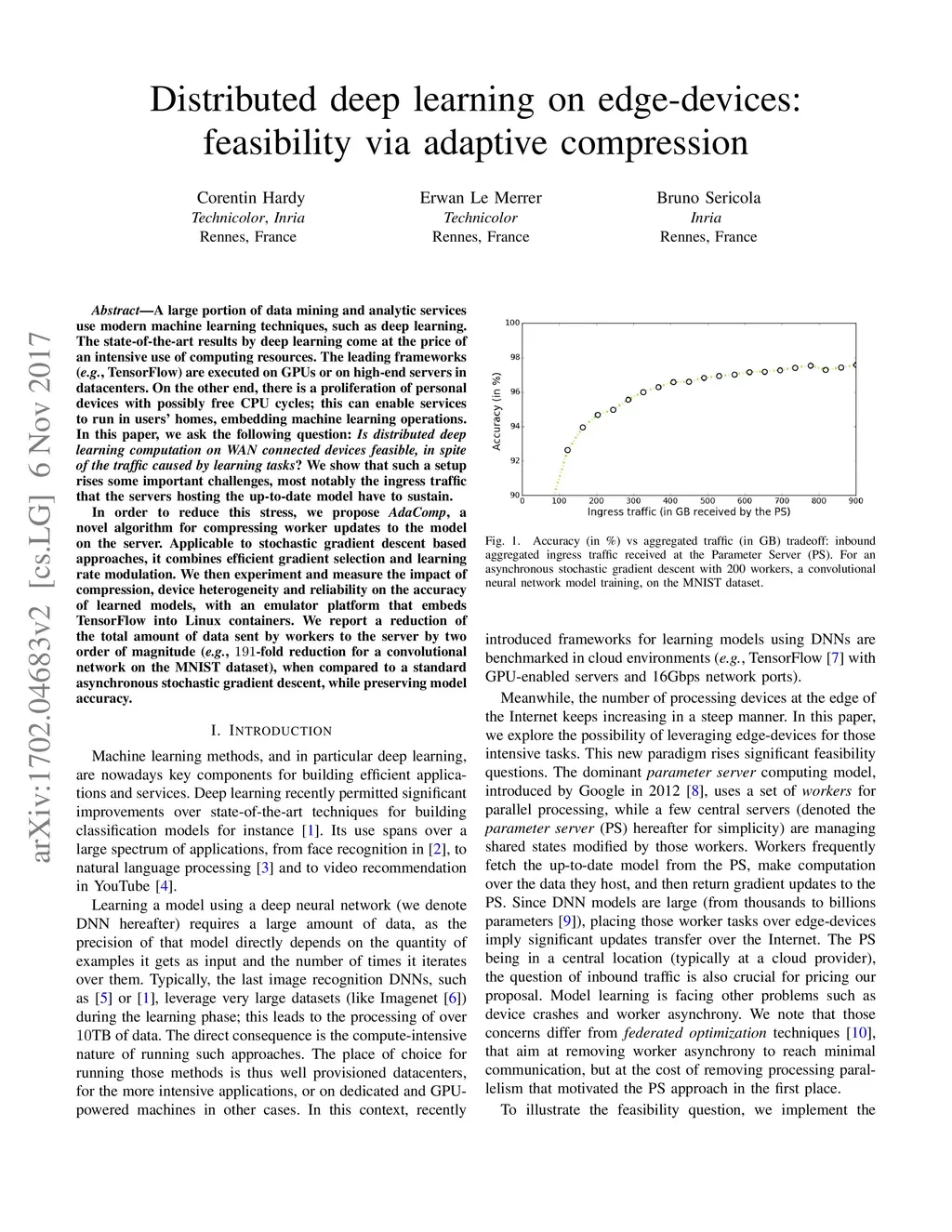 A large portion of data mining and analytic services use modern machine learning techniques, such as deep learning. The state-of-the-art results by deep learning come at the price of an intensive use of computing resources. The leading frameworks (e.g., TensorFlow) are executed on GPUs or on high-end servers in datacenters. On the other end, there is a proliferation of personal devices with possibly free CPU cycles; this can enable services to run in users' homes, embedding machine learning operations. In this paper, we ask the following question: Is distributed deep learning computation on WAN connected devices feasible, in spite of the traffic caused by learning tasks? We show that such a setup rises some important challenges, most notably the ingress traffic that the servers hosting the up-to-date model have to sustain. In order to reduce this stress, we propose adaComp, a novel algorithm for compressing worker updates to the model on the server. Applicable to stochastic gradient descent based approaches, it combines efficient gradient selection and learning rate modulation. We then experiment and measure the impact of compression, device heterogeneity and reliability on the accuracy of learned models, with an emulator platform that embeds TensorFlow into Linux containers. We report a reduction of the total amount of data sent by workers to the server by two order of magnitude (e.g., 191-fold reduction for a convolutional network on the MNIST dataset), when compared to a standard asynchronous stochastic gradient descent, while preserving model accuracy.