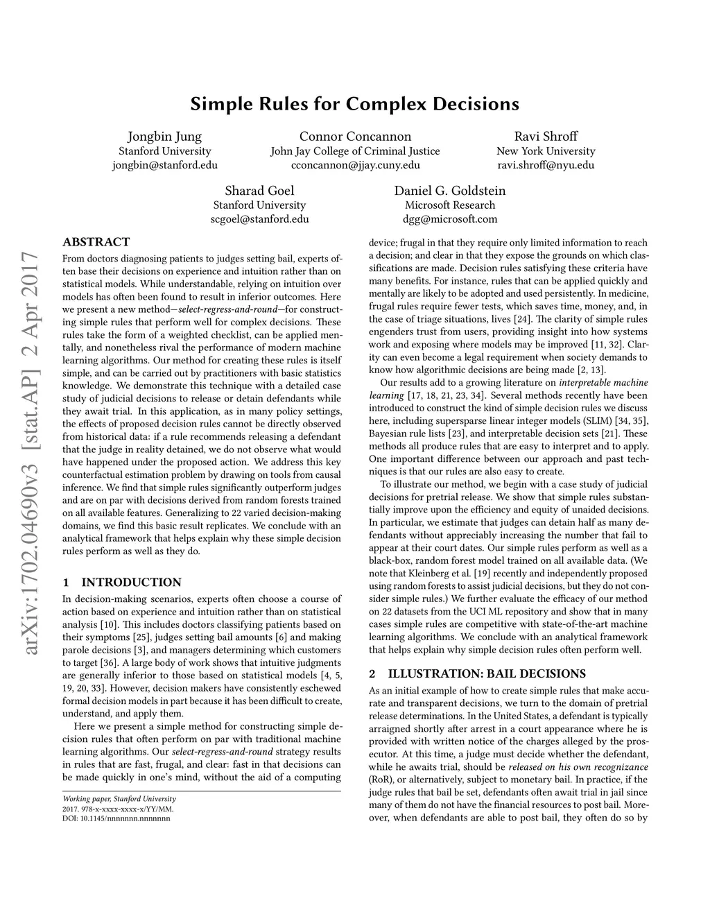 From doctors diagnosing patients to judges setting bail, experts often base their decisions on experience and intuition rather than on statistical models. While understandable, relying on intuition over models has often been found to result in inferior outcomes. Here we present a new method, select-regress-and-round, for constructing simple rules that perform well for complex decisions. These rules take the form of a weighted checklist, can be applied mentally, and nonetheless rival the performance of modern machine learning algorithms. Our method for creating these rules is itself simple, and can be carried out by practitioners with basic statistics knowledge. We demonstrate this technique with a detailed case study of judicial decisions to release or detain defendants while they await trial. In this application, as in many policy settings, the effects of proposed decision rules cannot be directly observed from historical data: if a rule recommends releasing a defendant that the judge in reality detained, we do not observe what would have happened under the proposed action. We address this key counterfactual estimation problem by drawing on tools from causal inference. We find that simple rules significantly outperform judges and are on par with decisions derived from random forests trained on all available features. Generalizing to 22 varied decision-making domains, we find this basic result replicates. We conclude with an analytical framework that helps explain why these simple decision rules perform as well as they do.