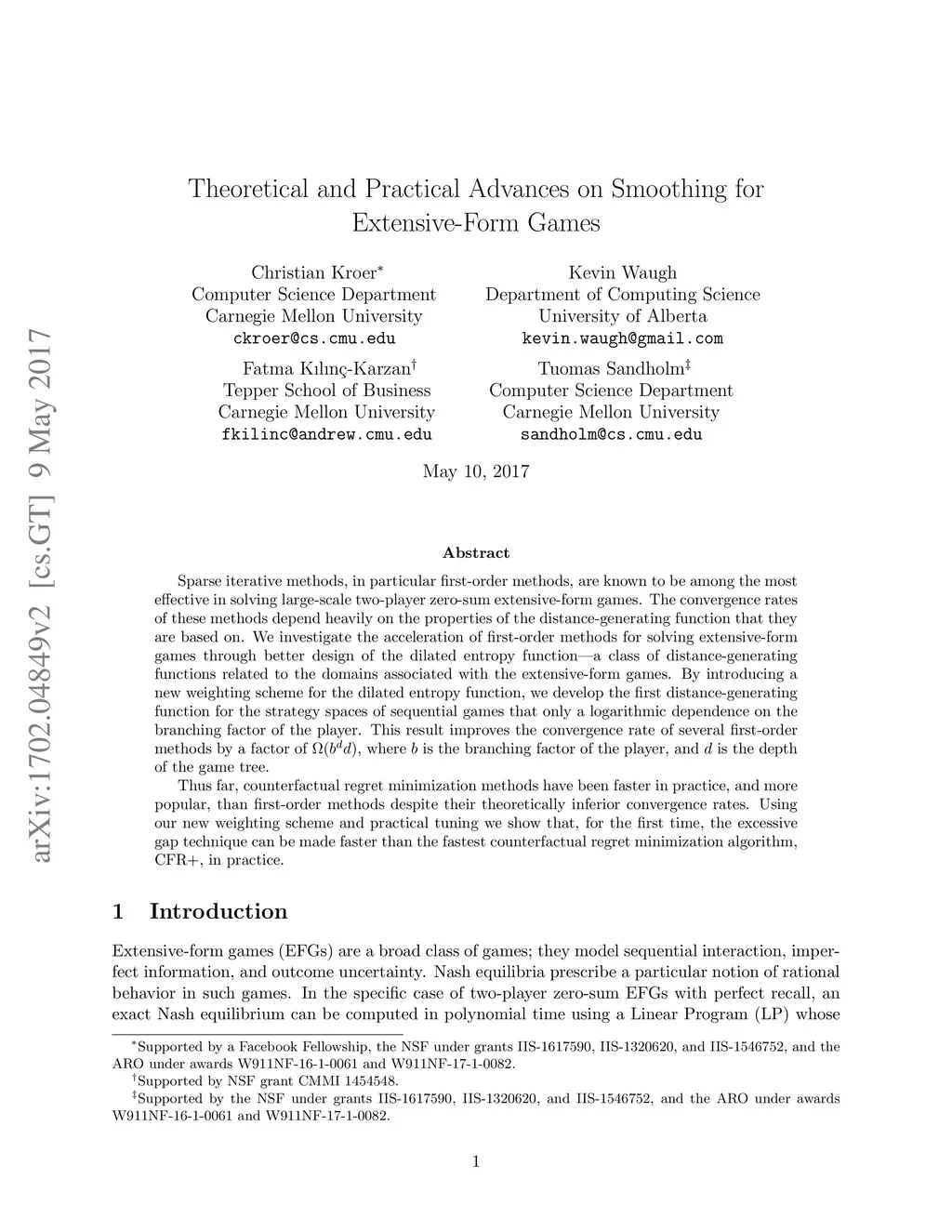 Sparse iterative methods, in particular first-order methods, are known to be among the most effective in solving large-scale two-player zero-sum extensive-form games. The convergence rates of these methods depend heavily on the properties of the distance-generating function that they are based on. We investigate the acceleration of first-order methods for solving extensive-form games through better design of the dilated entropy function---a class of distance-generating functions related to the domains associated with the extensive-form games. By introducing a new weighting scheme for the dilated entropy function, we develop the first distance-generating function for the strategy spaces of sequential games that has no dependence on the branching factor of the player. This result improves the convergence rate of several first-order methods by a factor of , where is the branching factor of the player, and is the depth of the game tree. Thus far, counterfactual regret minimization methods have been faster in practice, and more popular, than first-order methods despite their theoretically inferior convergence rates. Using our new weighting scheme and practical tuning we show that, for the first time, the excessive gap technique can be made faster than the fastest counterfactual regret minimization algorithm, CFR+, in practice.