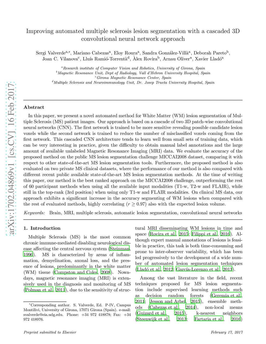 In this paper, we present a novel automated method for White Matter (WM) lesion segmentation of Multiple Sclerosis (MS) patient images. Our approach is based on a cascade of two 3D patch-wise convolutional neural networks (CNN). The first network is trained to be more sensitive revealing possible candidate lesion voxels while the second network is trained to reduce the number of misclassified voxels coming from the first network. This cascaded CNN architecture tends to learn well from small sets of training data, which can be very interesting in practice, given the difficulty to obtain manual label annotations and the large amount of available unlabeled Magnetic Resonance Imaging (MRI) data. We evaluate the accuracy of the proposed method on the public MS lesion segmentation challenge MICCAI2008 dataset, comparing it with respect to other state-of-the-art MS lesion segmentation tools. Furthermore, the proposed method is also evaluated on two private MS clinical datasets, where the performance of our method is also compared with different recent public available state-of-the-art MS lesion segmentation methods. At the time of writing this paper, our method is the best ranked approach on the MICCAI2008 challenge, outperforming the rest of 60 participant methods when using all the available input modalities (T1-w, T2-w and FLAIR), while still in the top-rank (3rd position) when using only T1-w and FLAIR modalities. On clinical MS data, our approach exhibits a significant increase in the accuracy segmenting of WM lesions when compared with the rest of evaluated methods, highly correlating () also with the expected lesion volume.