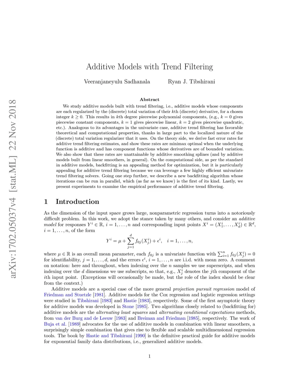 We consider additive models built with trend filtering, i.e., additive models whose components are each regularized by the (discrete) total variation of their st (discrete) derivative, for a chosen integer . This results in th degree piecewise polynomial components, (e.g., gives piecewise constant components, gives piecewise linear, gives piecewise quadratic, etc.). In univariate nonparametric regression, the localized nature of the total variation regularizer used by trend filtering has been shown to produce estimates with superior local adaptivity to those from smoothing splines (and linear smoothers, more generally) (Tibshirani [2014]). Further, the structured nature of this regularizer has been shown to lead to highly efficient computational routines for trend filtering (Kim et al. [2009], Ramdas and Tibshirani [2016]). In this paper, we argue that both of these properties carry over to the additive models setting. We derive fast error rates for additive trend filtering estimates, and prove that these rates are minimax optimal when the underlying function is itself additive and has component functions whose derivatives are of bounded variation. We show that such rates are unattainable by additive smoothing splines (and by additive models built from linear smoothers, in general). We argue that backfitting provides an efficient algorithm for additive trend filtering, as it is built around the fast univariate trend filtering solvers; moreover, we describe a modified backfitting procedure whose iterations can be run in parallel. Finally, we conduct experiments to examine the empirical properties of additive trend filtering, and outline some possible extensions.