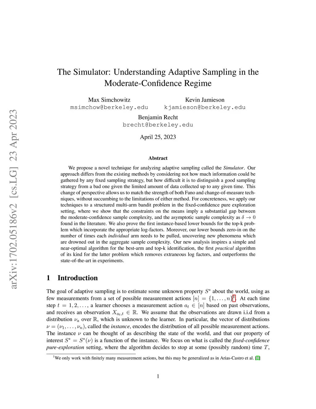 We propose a novel technique for analyzing adaptive sampling called the {\em Simulator}. Our approach differs from the existing methods by considering not how much information could be gathered by any fixed sampling strategy, but how difficult it is to distinguish a good sampling strategy from a bad one given the limited amount of data collected up to any given time. This change of perspective allows us to match the strength of both Fano and change-of-measure techniques, without succumbing to the limitations of either method. For concreteness, we apply our techniques to a structured multi-arm bandit problem in the fixed-confidence pure exploration setting, where we show that the constraints on the means imply a substantial gap between the moderate-confidence sample complexity, and the asymptotic sample complexity as found in the literature. We also prove the first instance-based lower bounds for the top-k problem which incorporate the appropriate log-factors. Moreover, our lower bounds zero-in on the number of times each \emph{individual} arm needs to be pulled, uncovering new phenomena which are drowned out in the aggregate sample complexity. Our new analysis inspires a simple and near-optimal algorithm for the best-arm and top-k identification, the first {\em practical} algorithm of its kind for the latter problem which removes extraneous log factors, and outperforms the state-of-the-art in experiments.