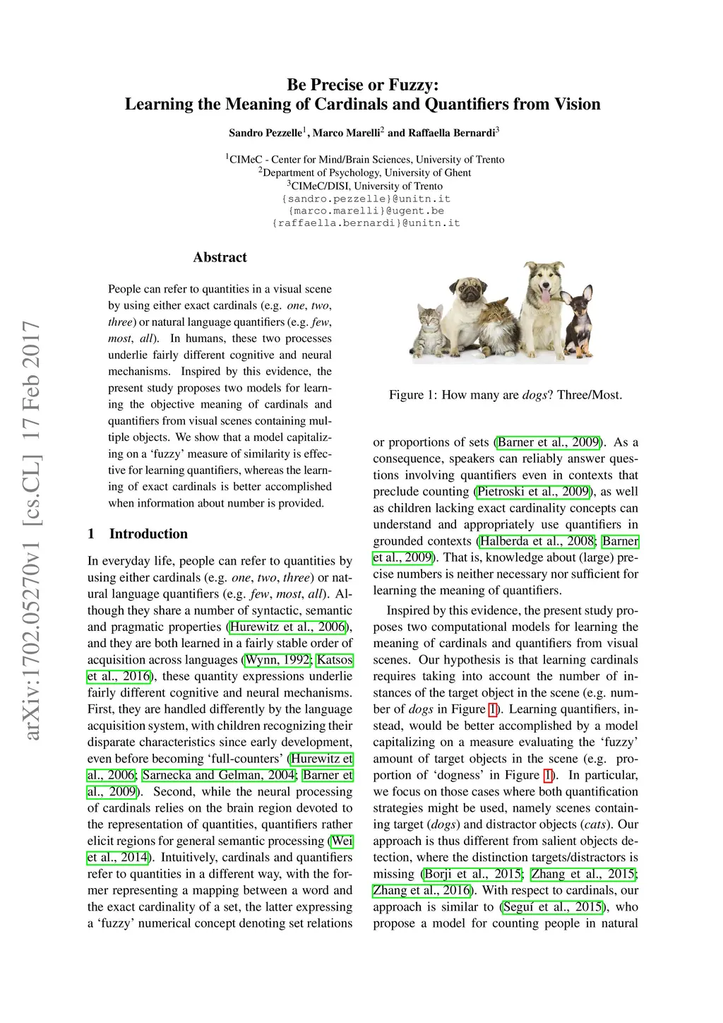 People can refer to quantities in a visual scene by using either exact cardinals (e.g. one, two, three) or natural language quantifiers (e.g. few, most, all). In humans, these two processes underlie fairly different cognitive and neural mechanisms. Inspired by this evidence, the present study proposes two models for learning the objective meaning of cardinals and quantifiers from visual scenes containing multiple objects. We show that a model capitalizing on a 'fuzzy' measure of similarity is effective for learning quantifiers, whereas the learning of exact cardinals is better accomplished when information about number is provided.