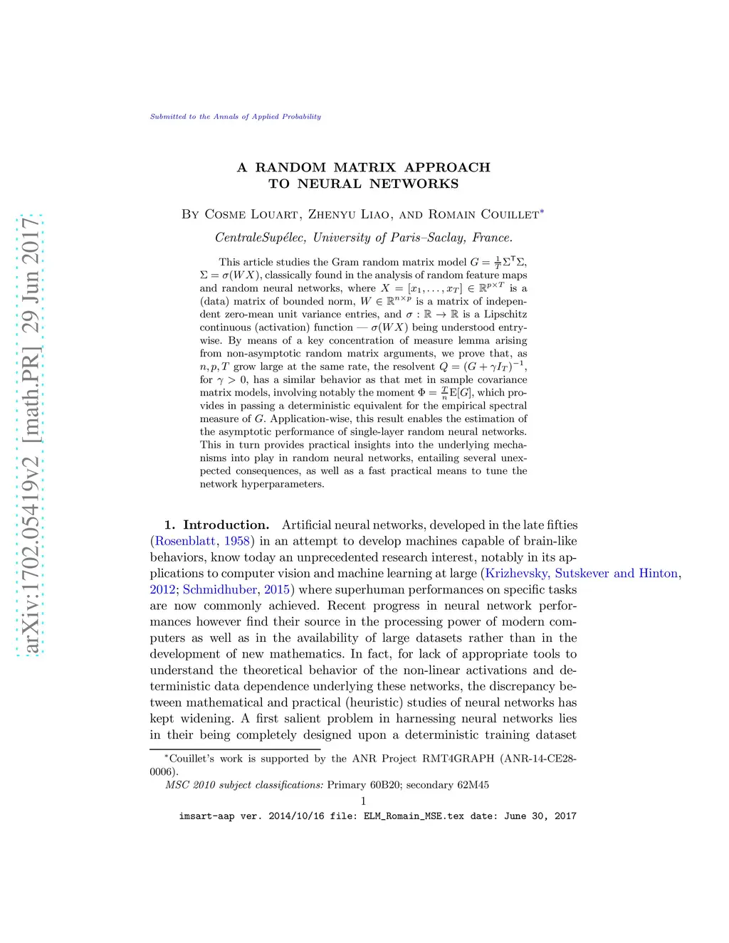 A Random Matrix Approach to Neural Networks