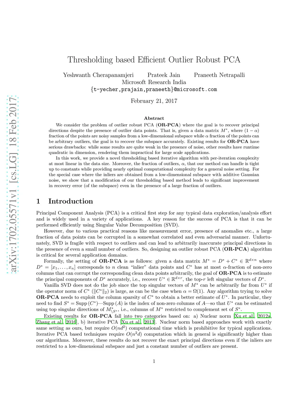 We consider the problem of outlier robust PCA (OR-PCA) where the goal is to recover principal directions despite the presence of outlier data points. That is, given a data matrix , where fraction of the points are noisy samples from a low-dimensional subspace while fraction of the points can be arbitrary outliers, the goal is to recover the subspace accurately. Existing results for \OR-PCA have serious drawbacks: while some results are quite weak in the presence of noise, other results have runtime quadratic in dimension, rendering them impractical for large scale applications. In this work, we provide a novel thresholding based iterative algorithm with per-iteration complexity at most linear in the data size. Moreover, the fraction of outliers, , that our method can handle is tight up to constants while providing nearly optimal computational complexity for a general noise setting. For the special case where the inliers are obtained from a low-dimensional subspace with additive Gaussian noise, we show that a modification of our thresholding based method leads to significant improvement in recovery error (of the subspace) even in the presence of a large fraction of outliers.