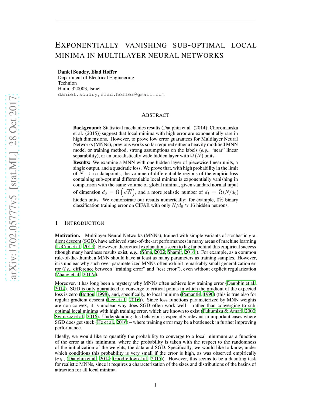 Background: Statistical mechanics results (Dauphin et al. (2014); Choromanska et al. (2015)) suggest that local minima with high error are exponentially rare in high dimensions. However, to prove low error guarantees for Multilayer Neural Networks (MNNs), previous works so far required either a heavily modified MNN model or training method, strong assumptions on the labels (e.g., "near" linear separability), or an unrealistic hidden layer with units. Results: We examine a MNN with one hidden layer of piecewise linear units, a single output, and a quadratic loss. We prove that, with high probability in the limit of datapoints, the volume of differentiable regions of the empiric loss containing sub-optimal differentiable local minima is exponentially vanishing in comparison with the same volume of global minima, given standard normal input of dimension , and a more realistic number of hidden units. We demonstrate our results numerically: for example, binary classification training error on CIFAR with only hidden neurons.