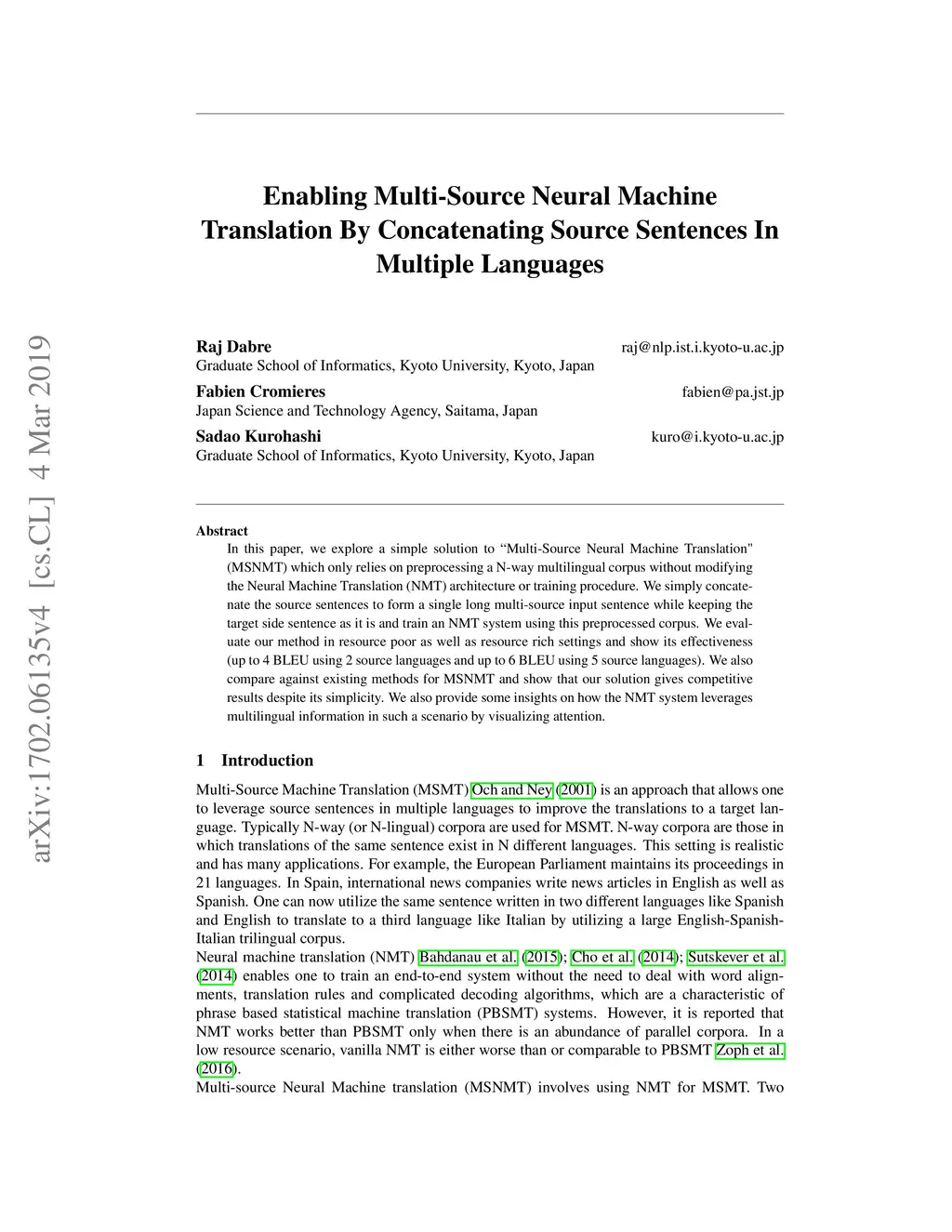 Enabling Multi-Source Neural Machine Translation By Concatenating Source
