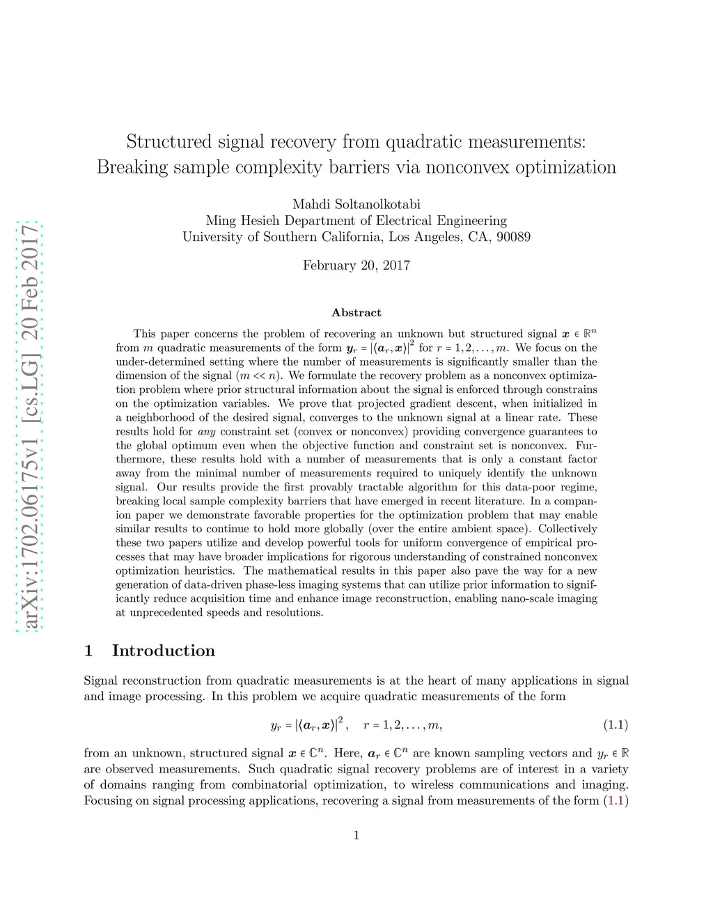 This paper concerns the problem of recovering an unknown but structured signal from quadratic measurements of the form for . We focus on the under-determined setting where the number of measurements is significantly smaller than the dimension of the signal (). We formulate the recovery problem as a nonconvex optimization problem where prior structural information about the signal is enforced through constrains on the optimization variables. We prove that projected gradient descent, when initialized in a neighborhood of the desired signal, converges to the unknown signal at a linear rate. These results hold for any constraint set (convex or nonconvex) providing convergence guarantees to the global optimum even when the objective function and constraint set is nonconvex. Furthermore, these results hold with a number of measurements that is only a constant factor away from the minimal number of measurements required to uniquely identify the unknown signal. Our results provide the first provably tractable algorithm for this data-poor regime, breaking local sample complexity barriers that have emerged in recent literature. In a companion paper we demonstrate favorable properties for the optimization problem that may enable similar results to continue to hold more globally (over the entire ambient space). Collectively these two papers utilize and develop powerful tools for uniform convergence of empirical processes that may have broader implications for rigorous understanding of constrained nonconvex optimization heuristics. The mathematical results in this paper also pave the way for a new generation of data-driven phase-less imaging systems that can utilize prior information to significantly reduce acquisition time and enhance image reconstruction, enabling nano-scale imaging at unprecedented speeds and resolutions.