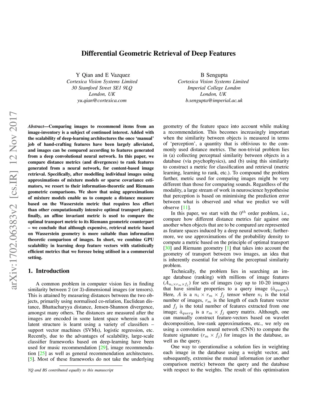 Comparing images to recommend items from an image-inventory is a subject of continued interest. Added with the scalability of deep-learning architectures the once `manual' job of hand-crafting features have been largely alleviated, and images can be compared according to features generated from a deep convolutional neural network. In this paper, we compare distance metrics (and divergences) to rank features generated from a neural network, for content-based image retrieval. Specifically, after modelling individual images using approximations of mixture models or sparse covariance estimators, we resort to their information-theoretic and Riemann geometric comparisons. We show that using approximations of mixture models enable us to compute a distance measure based on the Wasserstein metric that requires less effort than other computationally intensive optimal transport plans; finally, an affine invariant metric is used to compare the optimal transport metric to its Riemann geometric counterpart -- we conclude that although expensive, retrieval metric based on Wasserstein geometry is more suitable than information theoretic comparison of images. In short, we combine GPU scalability in learning deep feature vectors with statistically efficient metrics that we foresee being utilised in a commercial setting.