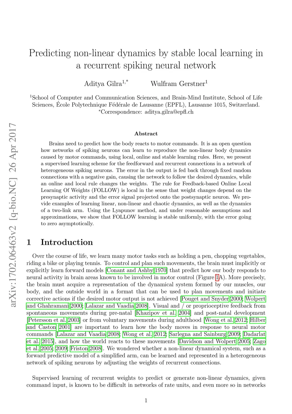 Brains need to predict how our muscles and body react to motor commands. How networks of spiking neurons can learn to reproduce these non-linear dynamics, using local, online and stable learning rules, is an important, open question. Here, we present a supervised learning scheme for the feedforward and recurrent connections in a network of heterogeneous spiking neurons. The error in the output is fed back through fixed random connections with a negative gain, causing the network to follow the desired dynamics, while an online and local rule changes the weights; hence we call the scheme FOLLOW (Feedback-based Online Local Learning Of Weights) The rule is local in the sense that weight changes depend on the presynaptic activity and the error signal projected onto the post-synaptic neuron. We provide examples of learning linear, non-linear and chaotic dynamics, as well as the dynamics of a two-link arm. Using the Lyapunov method, and under reasonable assumptions and approximations, we show that FOLLOW learning is uniformly stable, with the error going to zero asymptotically.