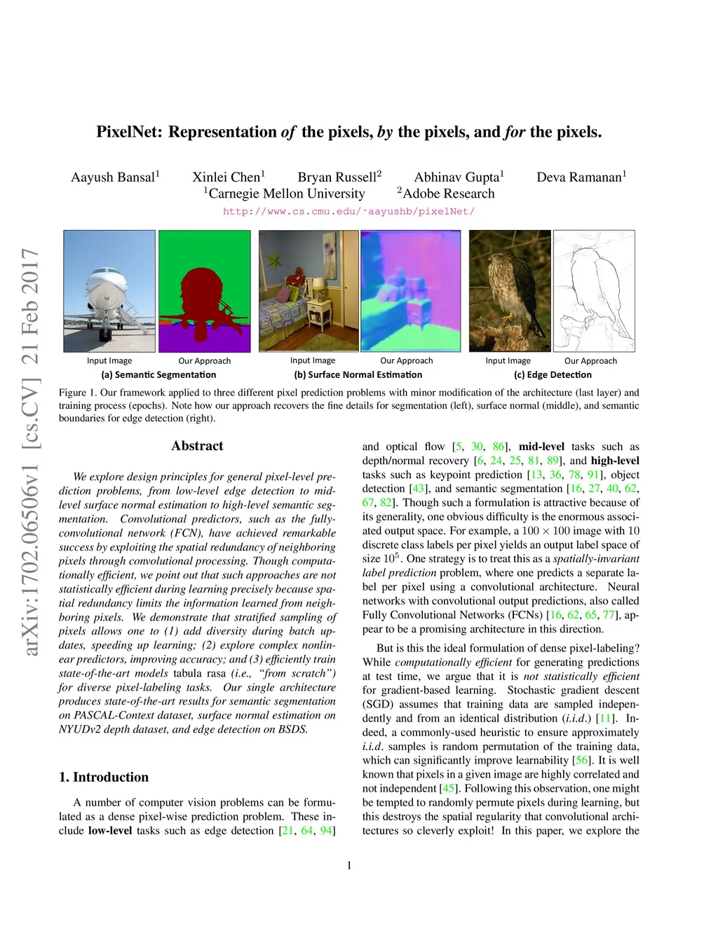 We explore design principles for general pixel-level prediction problems, from low-level edge detection to mid-level surface normal estimation to high-level semantic segmentation. Convolutional predictors, such as the fully-convolutional network (FCN), have achieved remarkable success by exploiting the spatial redundancy of neighboring pixels through convolutional processing. Though computationally efficient, we point out that such approaches are not statistically efficient during learning precisely because spatial redundancy limits the information learned from neighboring pixels. We demonstrate that stratified sampling of pixels allows one to (1) add diversity during batch updates, speeding up learning; (2) explore complex nonlinear predictors, improving accuracy; and (3) efficiently train state-of-the-art models tabula rasa (i.e., "from scratch") for diverse pixel-labeling tasks. Our single architecture produces state-of-the-art results for semantic segmentation on PASCAL-Context dataset, surface normal estimation on NYUDv2 depth dataset, and edge detection on BSDS.