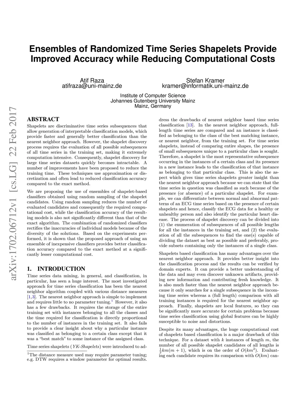Shapelets are discriminative time series subsequences that allow generation of interpretable classification models, which provide faster and generally better classification than the nearest neighbor approach. However, the shapelet discovery process requires the evaluation of all possible subsequences of all time series in the training set, making it extremely computation intensive. Consequently, shapelet discovery for large time series datasets quickly becomes intractable. A number of improvements have been proposed to reduce the training time. These techniques use approximation or discretization and often lead to reduced classification accuracy compared to the exact method. We are proposing the use of ensembles of shapelet-based classifiers obtained using random sampling of the shapelet candidates. Using random sampling reduces the number of evaluated candidates and consequently the required computational cost, while the classification accuracy of the resulting models is also not significantly different than that of the exact algorithm. The combination of randomized classifiers rectifies the inaccuracies of individual models because of the diversity of the solutions. Based on the experiments performed, it is shown that the proposed approach of using an ensemble of inexpensive classifiers provides better classification accuracy compared to the exact method at a significantly lesser computational cost.